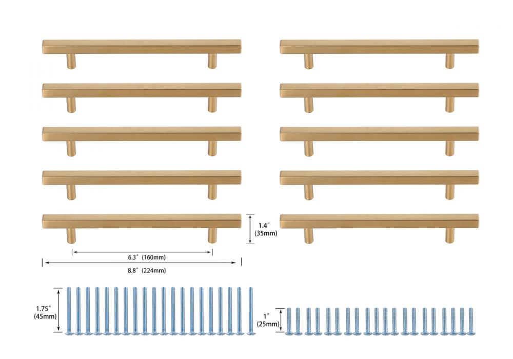 The stunning bar pulls are an instant dramatic upgrade to any kitchen, bathroom, or furniture. They are easy to install and provides a bold statement to your furniture. Each of the hardware conveniently comes with two sets of mounting screws to save your time and trip to the hardware store. The ten pack hardware is packaged individually to protect scratches of your timeless investment during shipping.