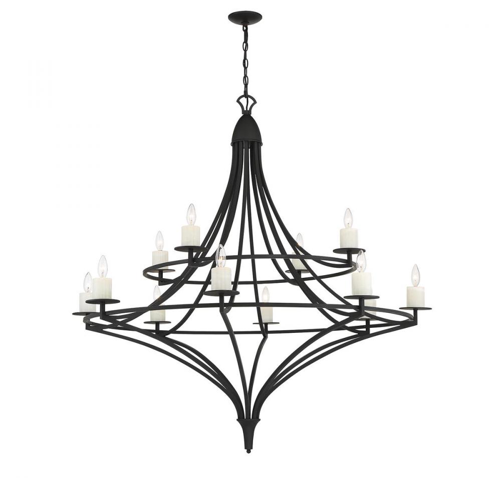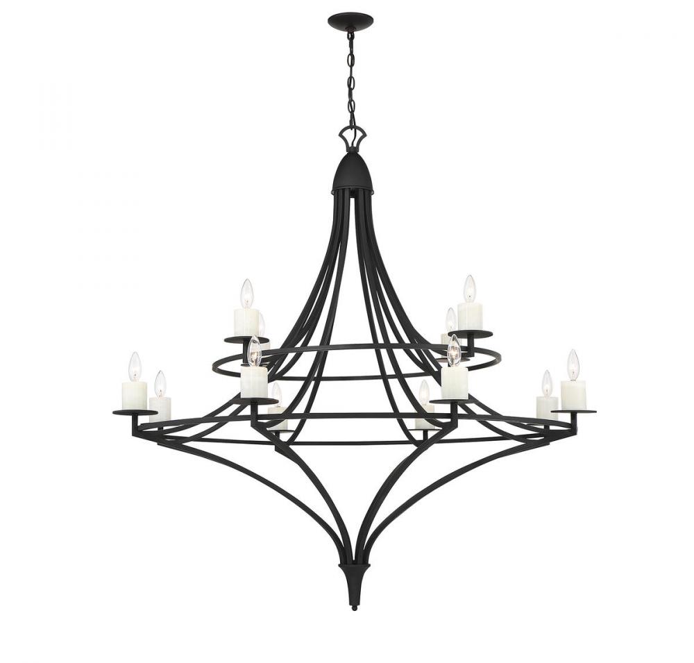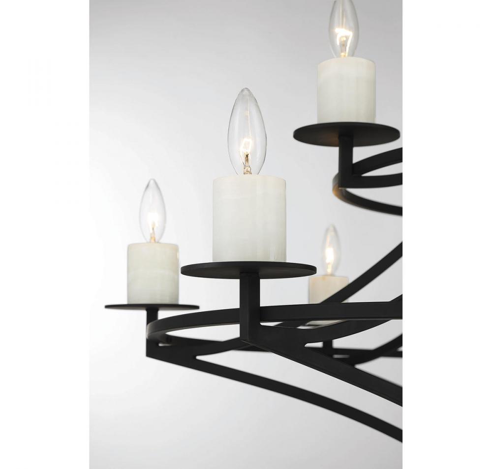 Large in size and bold in style, the Savoy House Director 12-light chandelier is perfectly suited to brighten and embolden bigger spaces. We took classic chandelier style and added a natural twist by using pieces of genuine stone for the candle sleeves. The white stone and the black finish are a perfect match. Director is 50" in height and 50" in width. It uses twelve standard size bulb of up to 60 watts per bulb. Comes with 120" of chain and 144" of cord.