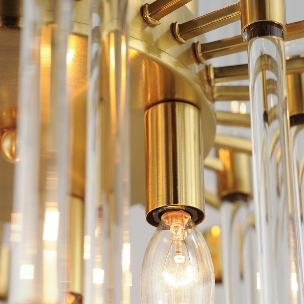 The composition of Clear glass rods are elegantly supported by thin radial arms of staggered lengths to create an iridescent motif that is truly Divine. Finished in Polished Nickel or Heritage Brass, the simplicity of this design delivers a crisp lighting