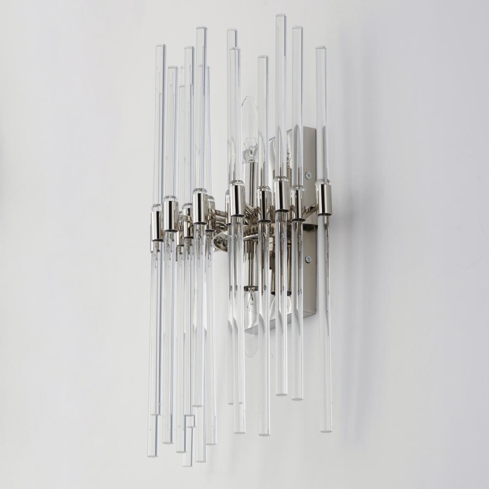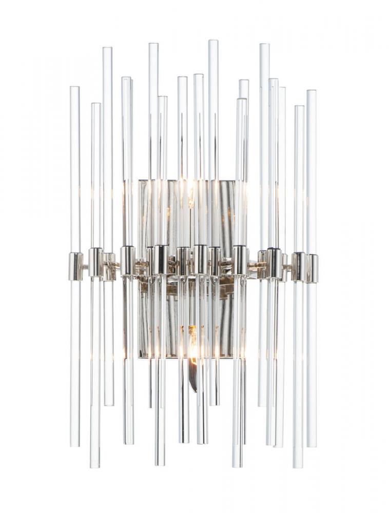 The composition of Clear glass rods are elegantly supported by thin radial arms of staggered lengths to create an iridescent motif that is truly Divine. Finished in Polished Nickel or Heritage Brass, the simplicity of this design delivers a crisp lighting