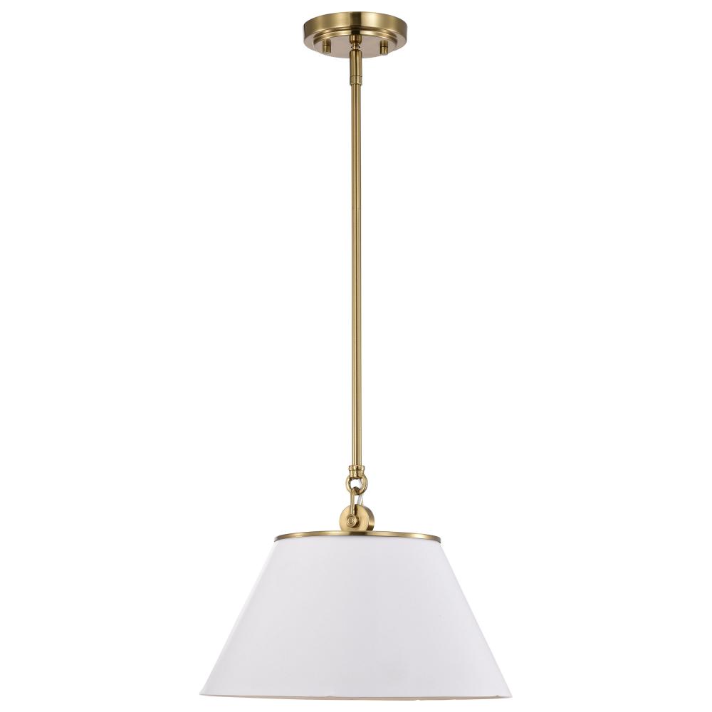 With subtle detailing, the Dover 60-7412 medium pendant is graceful yet unassuming. The simple white shade features a white lining to reflect the light, and the trim is finished in vintage brass to match the fixture's body. Place a trio of them over th