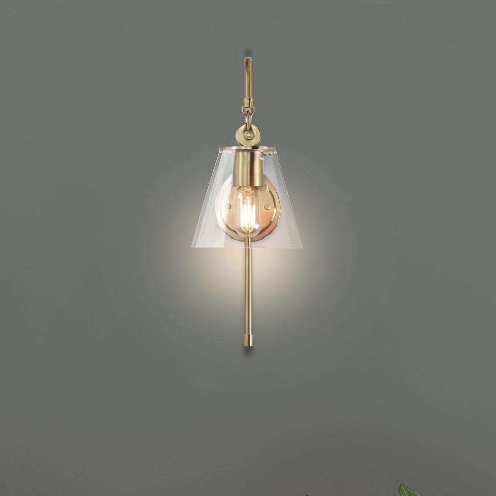 With subtle detailing, the Dover wall sconce is graceful yet unassuming. The simple clear glass shade features trim finished in vintage brass to match the fixture's body. Place in a dining room for ambiance, or bring added light to a dark hallway or en
