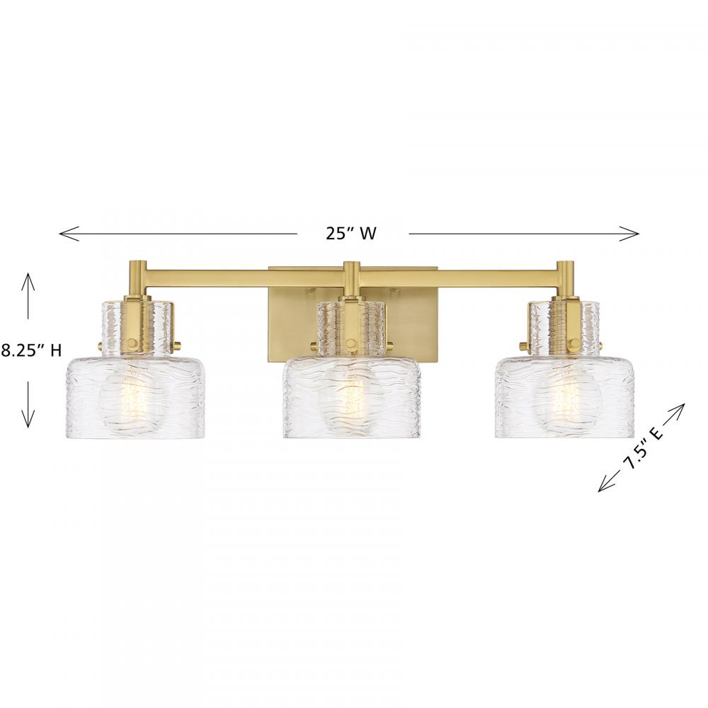 The Savoy House Dover 3-light bath light showcases standout bathroom lighting style! Clear glass shades feature a beautifully textured pattern that recalls ocean waves. These glass shades are held to the base by arms that are finished in Warm Brass and decorated with visible hardware to add a hint of vintage inspiration. Dover is 8.25" in height, 25" in width and extends 7.5" from the wall. It uses three standard size bulbs of up to 60 watts per bulb. Bulbs not included. Install as pictured. This bath bar is damp area rated.
