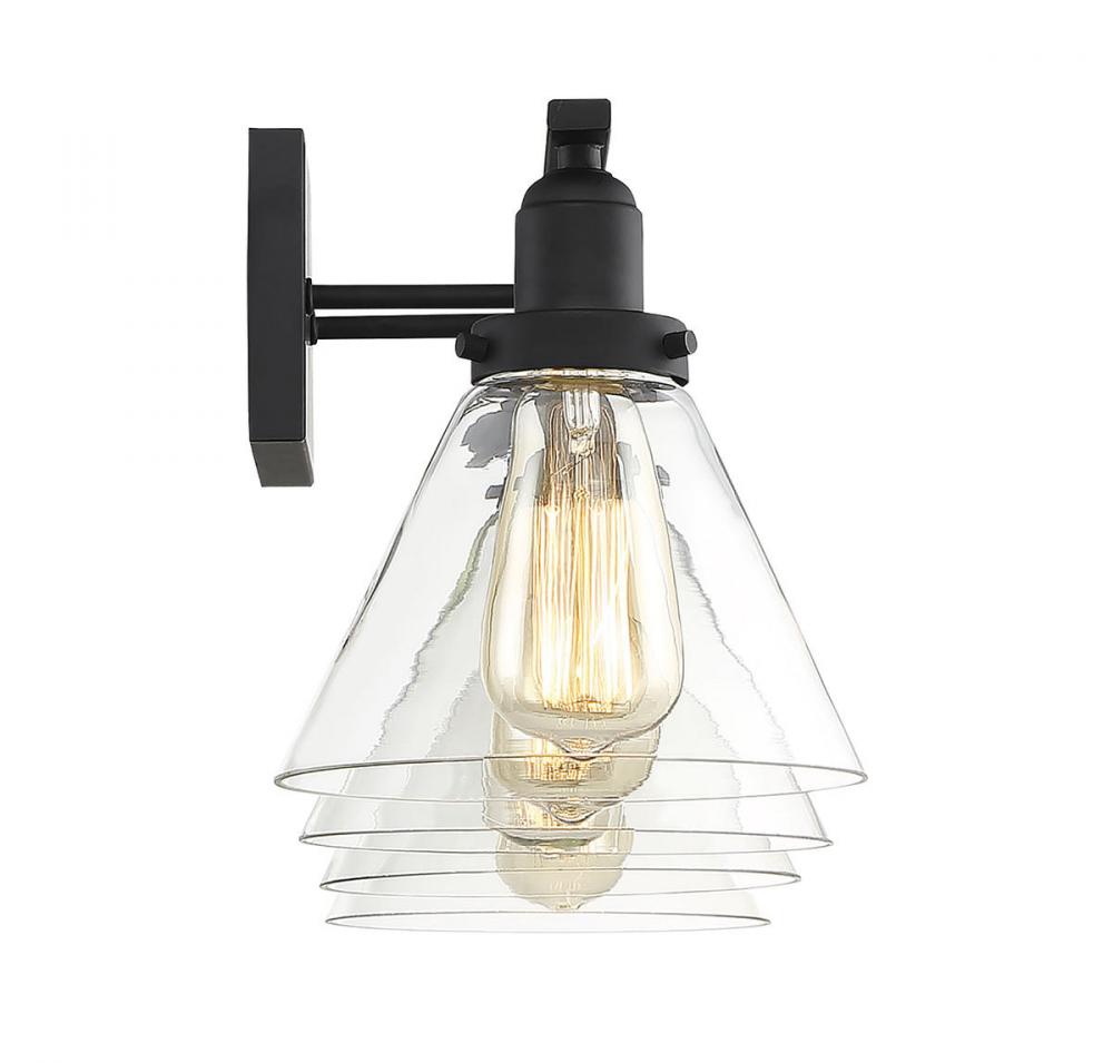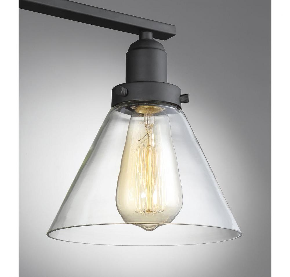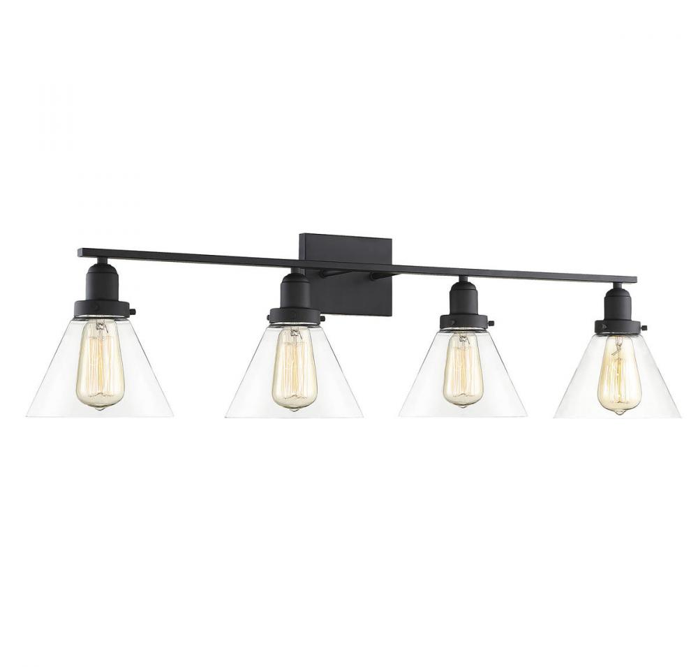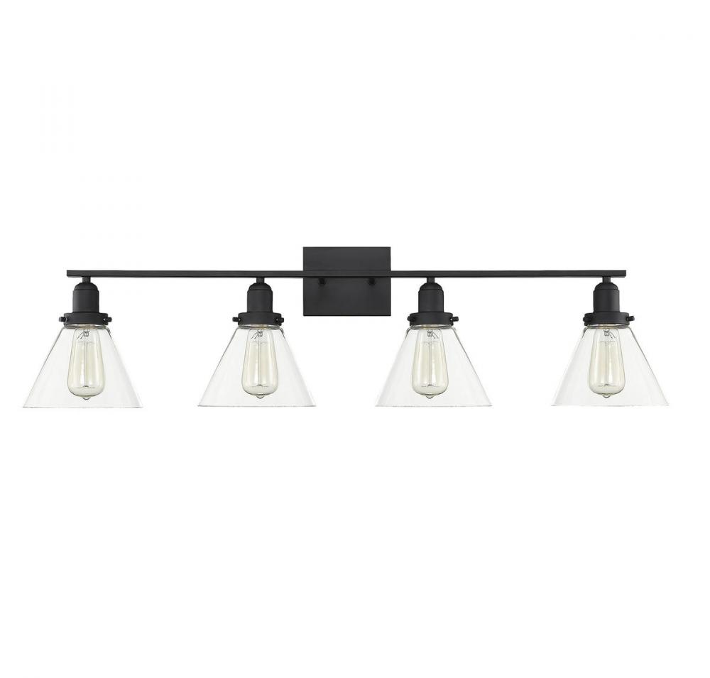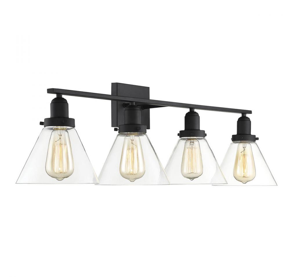 This Savoy House Drake 4-light bath bar has an alluringly simple style with a few choice hardware details and shades of clear glass. It may be mounted as either uplight or downlight. Bath bar lights are a classic choice for illuminating vanity mirrors in bathrooms big and small. Because the bulbs are exposed, try using stylized bulbs (not included) such as Edison for a different look! The matte black finish can be paired with black hardware or mixed with hardware in other fixtures. Add Drake to industrial, transitional or contemporary rooms for a bold look. When you choose a Savoy House lighting fixture, you can be certain you’ve selected a piece that will withstand the test of time.