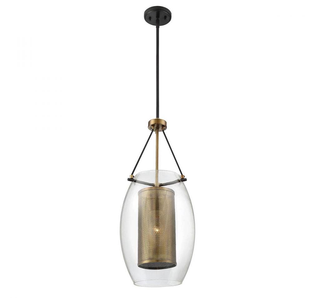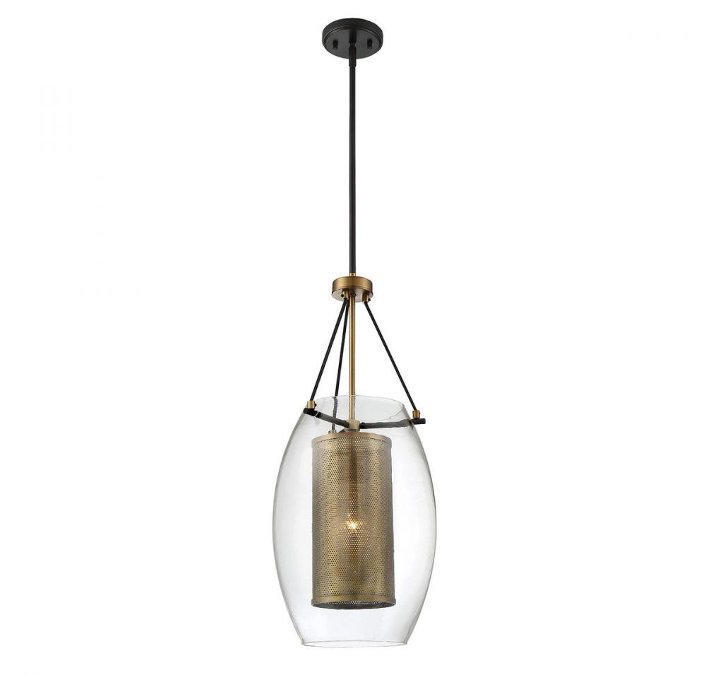 Ultra chic and current with its use of mixed metals, the fashionable Dunbar 1-light pendant was designed by Brian Thomas and manufactured with pride and precision by Savoy House. This contemporary light fixture features a warm brass mesh lantern covered by a clear glass oval and suspended by a sleek, bronzed metal rod. It’s an intriguing design that looks great as bath lighting, entry lighting, over a stairway or in the kitchen. Made with premium quality components, it has an adjustable rod length and canopy that adapts to sloped ceilings. Hang one, or hang several at varying heights for modern style lighting that moves! It’s an ideal interior lighting choice for transitional, contemporary, mid-century modern, and industrial décors.