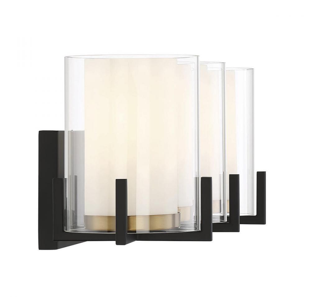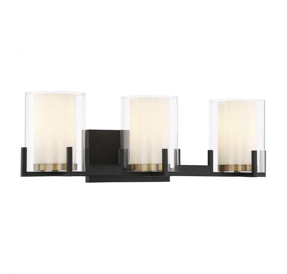 The Savoy House Eaton 3-light bath vanity light has an elegant and appealing look with shades of clear and white opal glass, jewelry-like prong detailing and a two-tone finish of black and brass. Create the illusion and beauty of candlelight with Eaton! This bath light is 7.5" in height, 24" in width and extends 7.5" from the wall. Uses three standard size bulbs of up to 60 watts per bulb. Damp area rated.