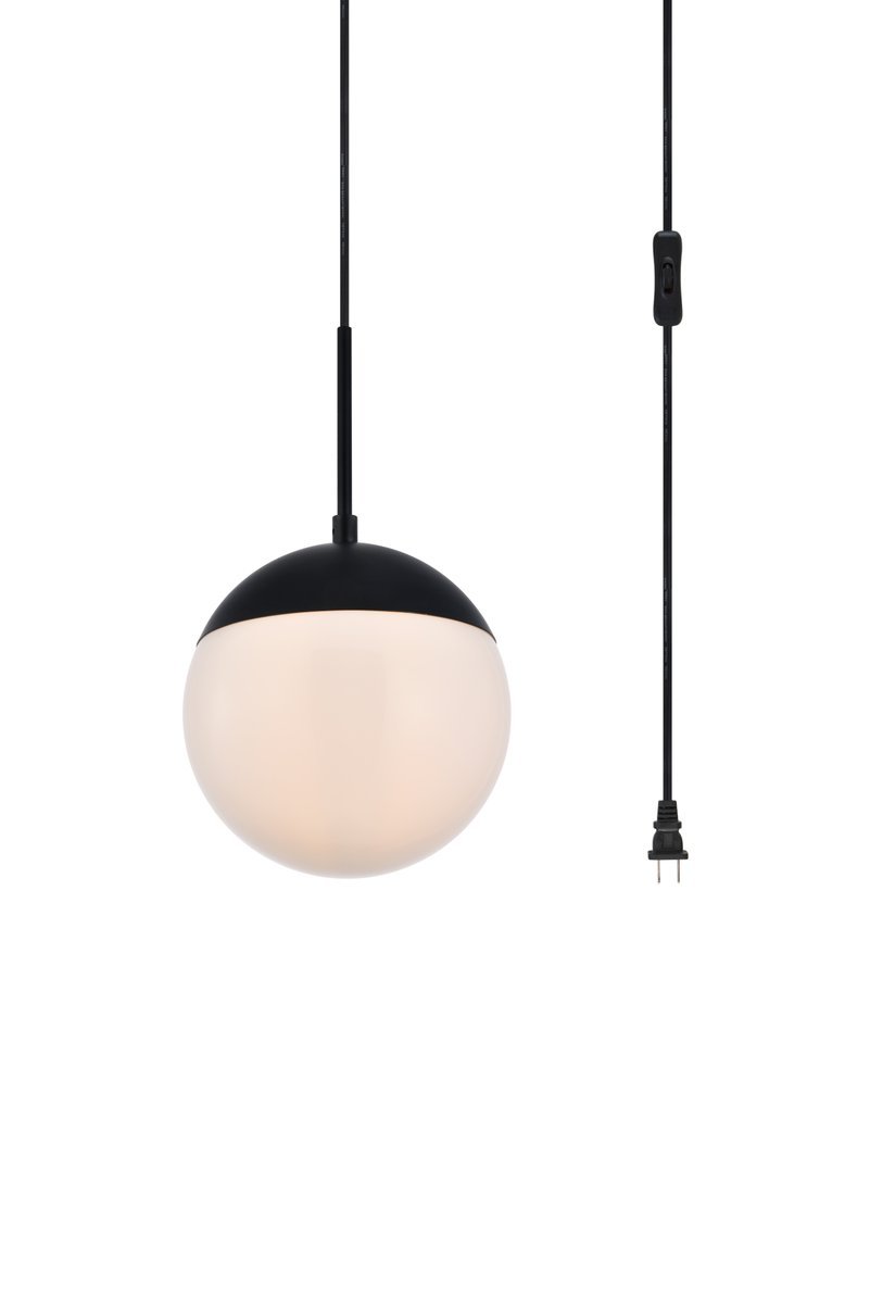 Refined style with a practical design, Eclipse plug in pendant lamps bring cosmopolitan sophistication anywhere, especially to an entryway, office, bathroom, bedroom, or kitchen. The smooth iron round frame comes in a black finish. A 15 foot black cord allows you to vary the hanging height off the swag hooks. Since this is a plug-in you can move it around easily to add light wherever you go. A touch of color on top of the frosted white spherical glass shade brings character to this classic style. Living in the big city has never been this easy. Simply hang this piece on the provided swag hooks and plug it in for an effortlessly easy installation - can be hung from a sloped or vaulted ceiling.