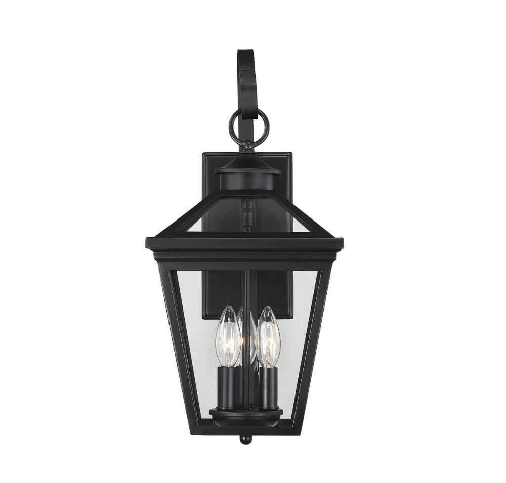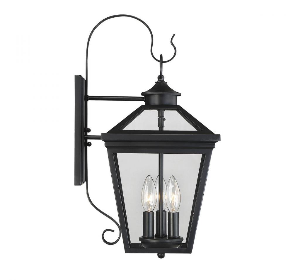 Brighten the exterior of your home and welcome your guests in style with the Savoy House Ellijay 3-light outdoor wall lantern. The design mimics a vintage gas lantern with a classic tapered box shape and decorative top finial. The black finish looks terrific and blends well with other hardware and architectural materials. Panes of clear glass fill all four side panels and the roof panels, too. Three 40W candelabra size bulbs provide inviting and secure illumination. This lantern measures 9" wide, 19" high and extends 11.25" from the wall. You’ll enjoy its timeless style and enhance the beauty of your property, whether on your porch, patio, sunroom, pergola or other outdoor walls in your garden and yard.