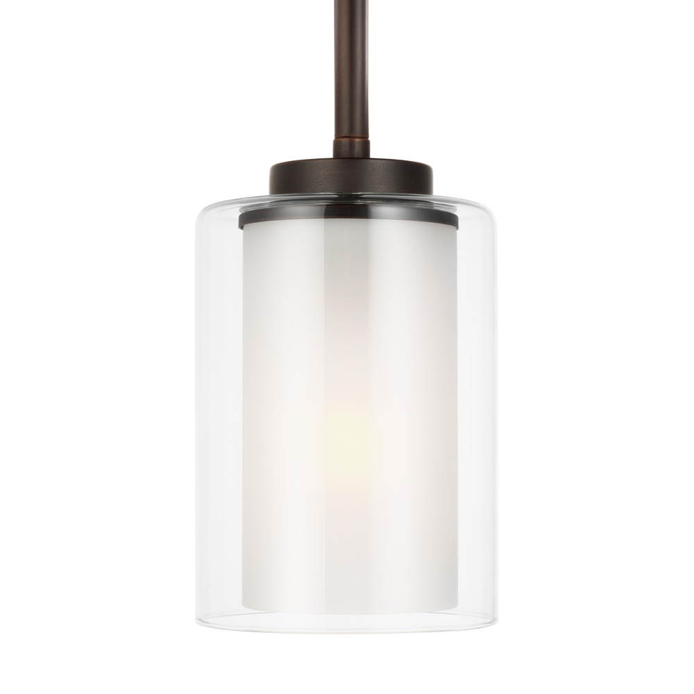 The Elmwood Park one light mini pendant in bronze supplies ample lighting for your daily needs, while adding a layer of today's style to your home's décor. Elmwood Park by has clear glass tube shades with an inner white glass element that softens the light and helps cast an even glow. A cylinder of etched glass is centered within a larger cylinder of clear glass which encircles each light bulb to create this stunning visual effect. The full assortment includes three-, five-and nine-light chandeliers, a four-light linear, one-light mini pendant, a three-light pendant, a two-light semi flush which is convertible into a pendant, and one-, two-, three- and four-light bath fixtures. All fixtures offered in either a Brushed Nickel or Brushed Oil Rubbed Bronze. Incandescent and ENERGY STAR-qualified LED lamping are available; all fixtures are California Title 24 compliant.