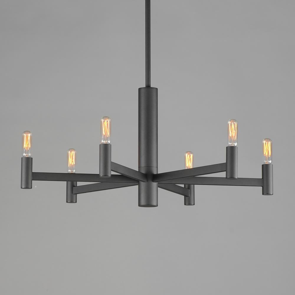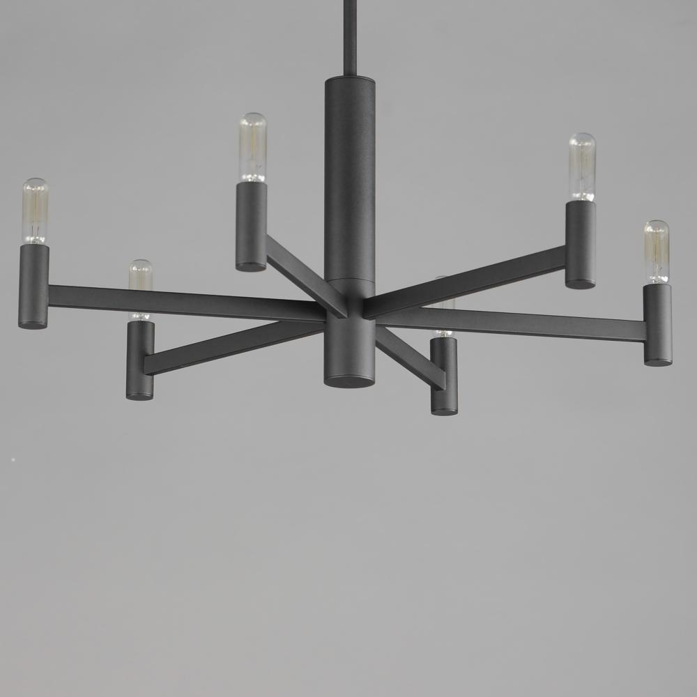 Straight extensions of rectilinear arms emanate from a cylindrical center housing in this transitional design. The candelabra is made in a corresponding cylindrical form playing into the geometries of this streamlined chandelier design. Available in a text