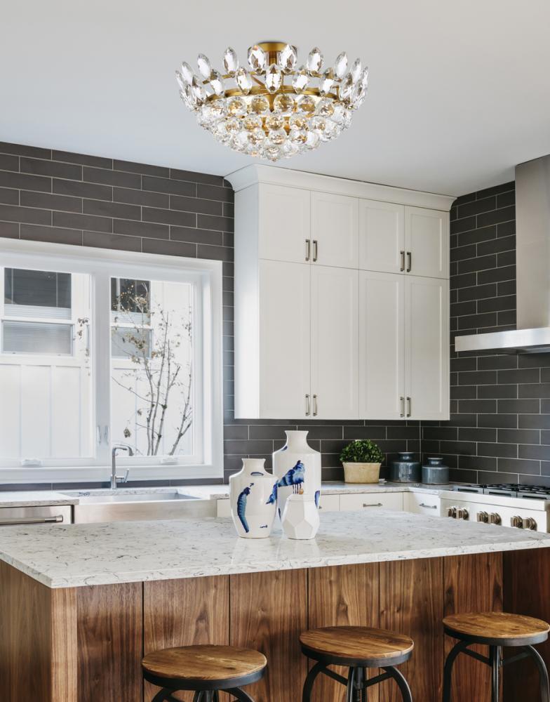 Tiers of clear multi-faceted crystals reflect the soft glow of candelabra bulbs