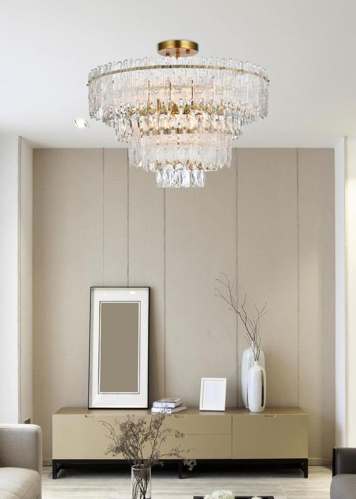 Features multiple tiers of high-quality crystal prisms that create a captivating display of light and sparkle.