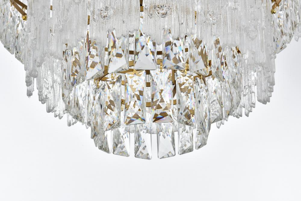 The combination of clear crystals and textured glass creates a sophisticated light play, perfect for setting an elegant mood.