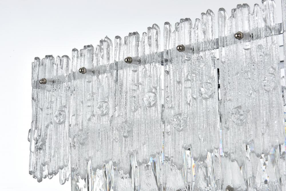 The combination of clear crystals and textured glass creates a sophisticated light play, perfect for setting an elegant mood.