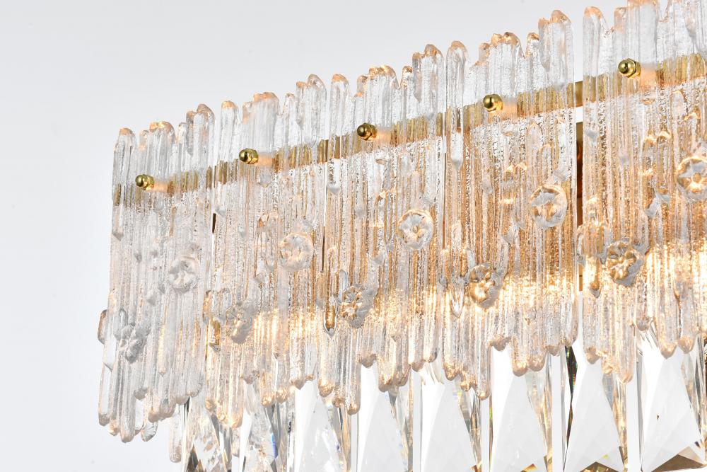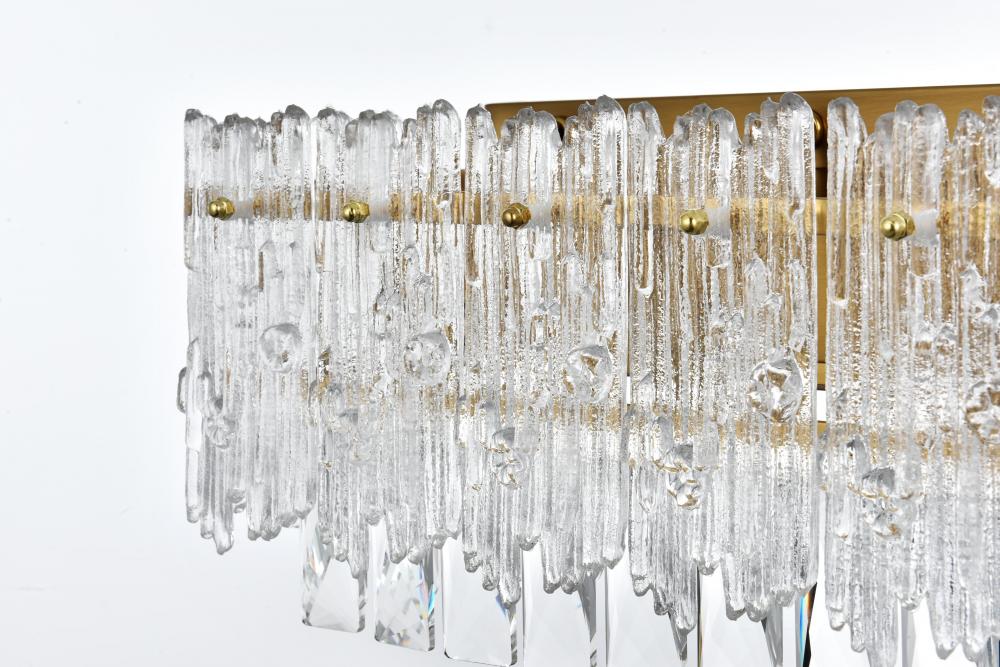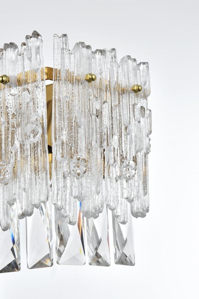 The combination of clear crystals and textured glass creates a sophisticated light play, perfect for setting an elegant mood.