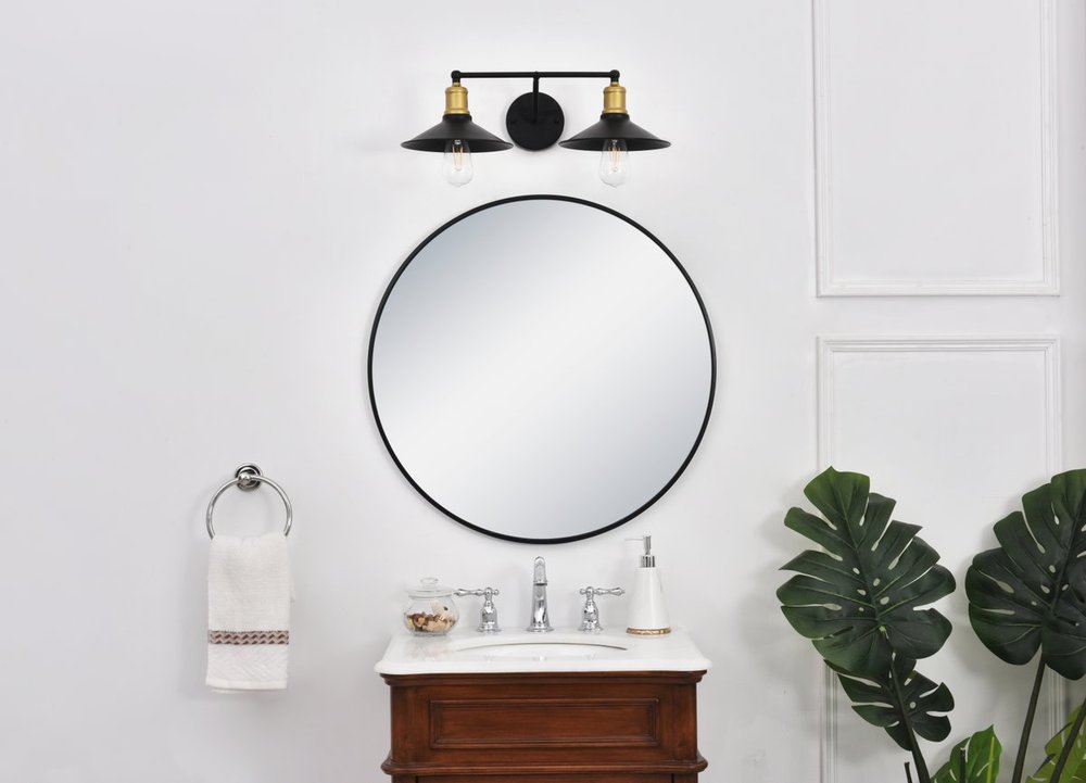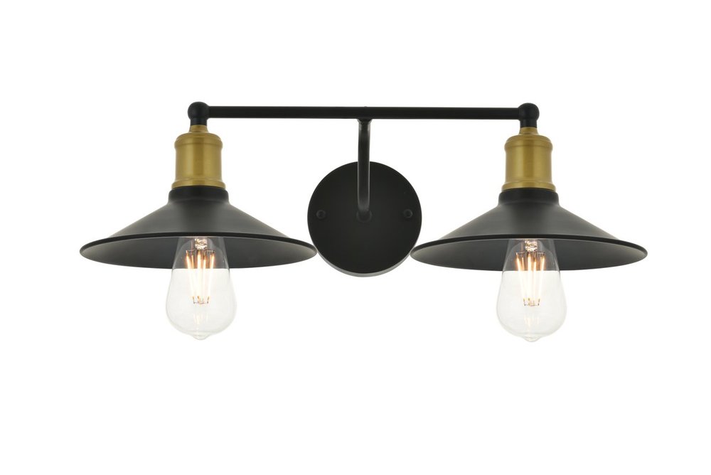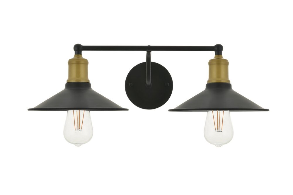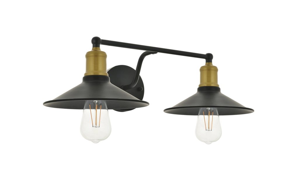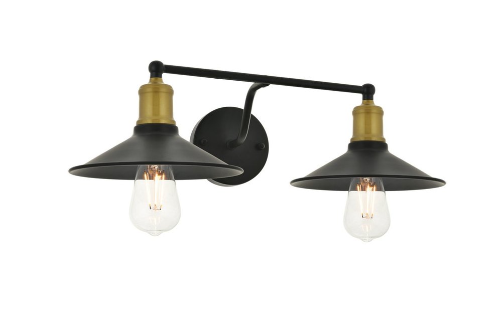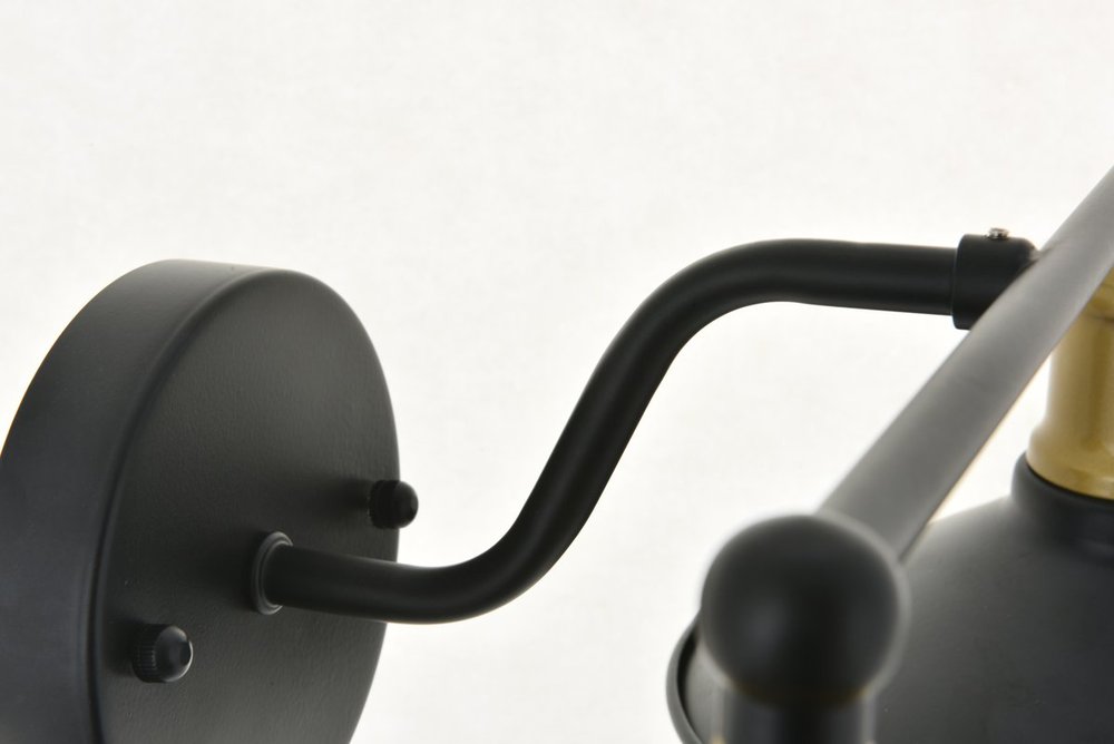 Two-toned brass and black finish 2-light wall sconce with a curved arm and cone shaped shade