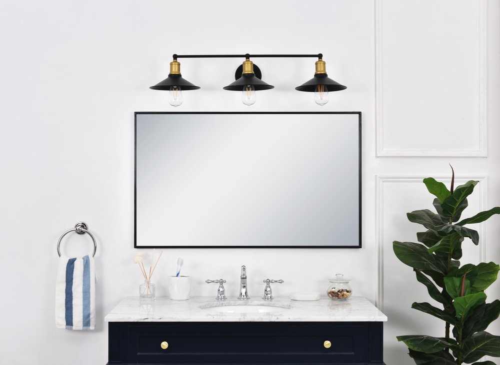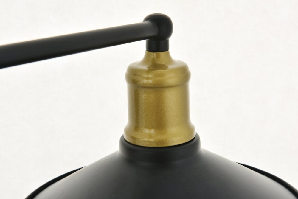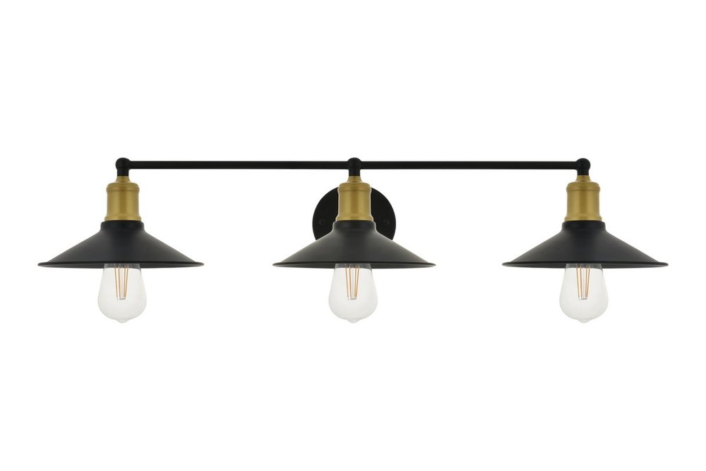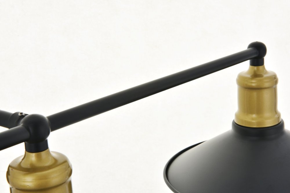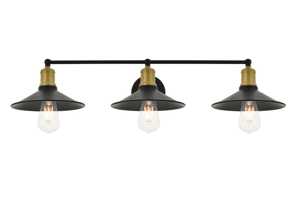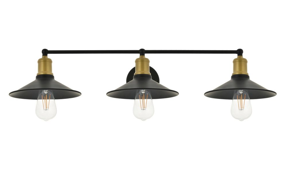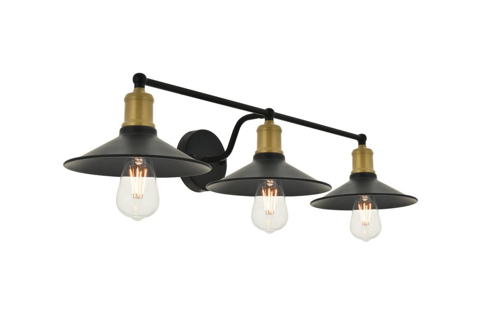 Two-toned brass and black finish 3-light wall sconce with a curved arm and cone shaped shade
