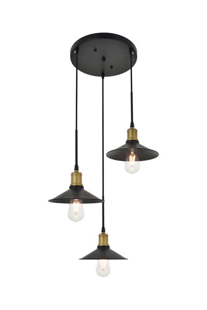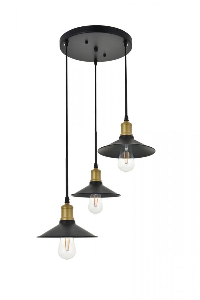 Two-toned brass and black finish 3-light pendant light with dome shaped shade suspended from a circular canopy