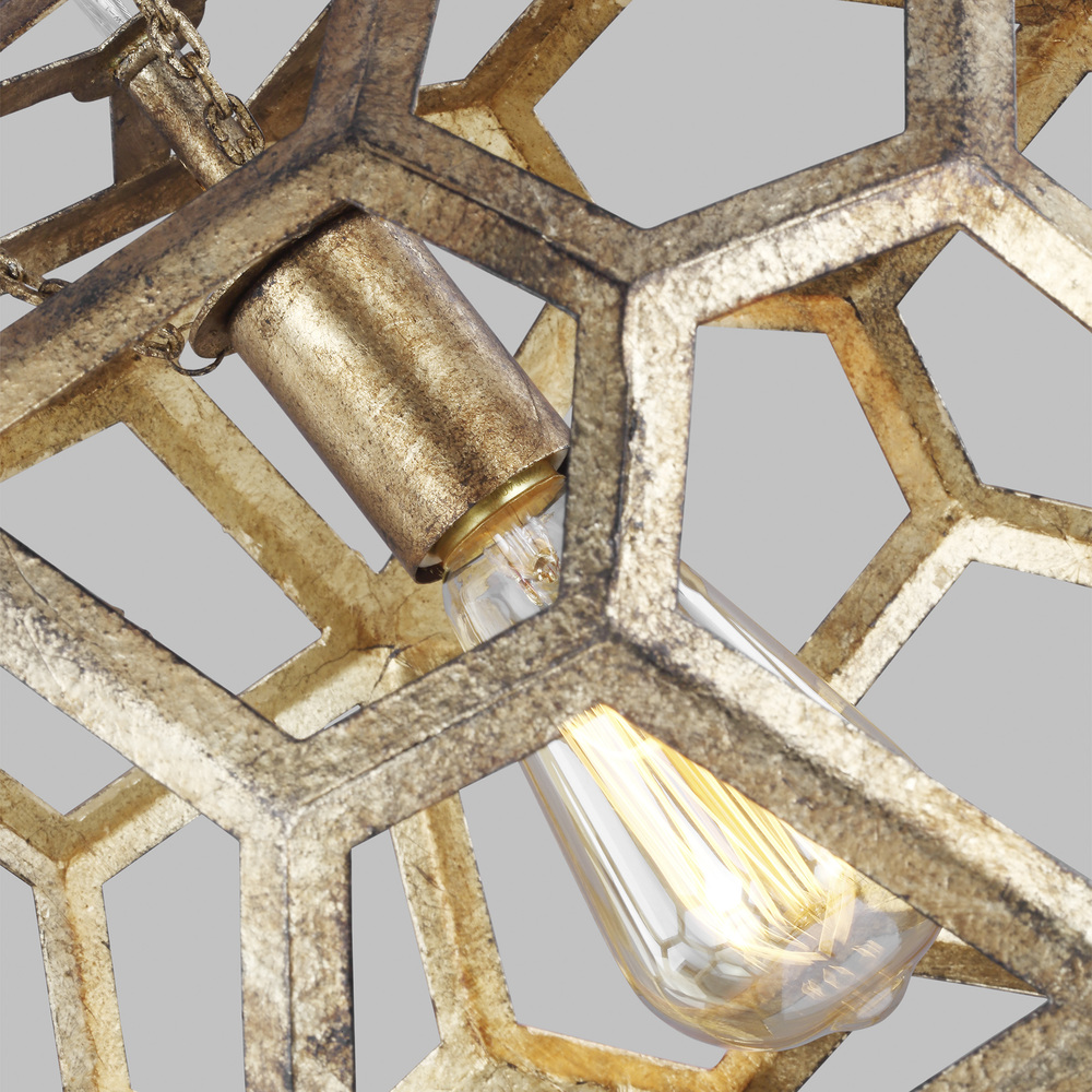The Alexa Hampton Feccetta one light indoor pendant in antique gild is elegantly charming with a Mid-Century Modern appeal. The fixture is suspended by matching polished brass chain links, and both the shade and socket are held by three smaller chain links. The combination of its circular form with hexagonal shaped cut-out frame, illuminates light from any choice of lamping and can be elegantly placed as the focal point over an island or kitchen table. Alexa Hampton is an industry force who honors tradition and commits to the future, providing smart, stylish, design-rich solutions for every aspect of the home.