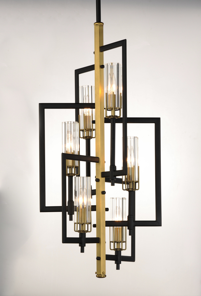 Dramatic and opulent, light sources shine through exquisite Clear scalloped glass hurricane shades as they seemingly float on unique metal prongs finished in Antique Brass. The brass accents are contrasted with a Black frame configured in cascading pendant