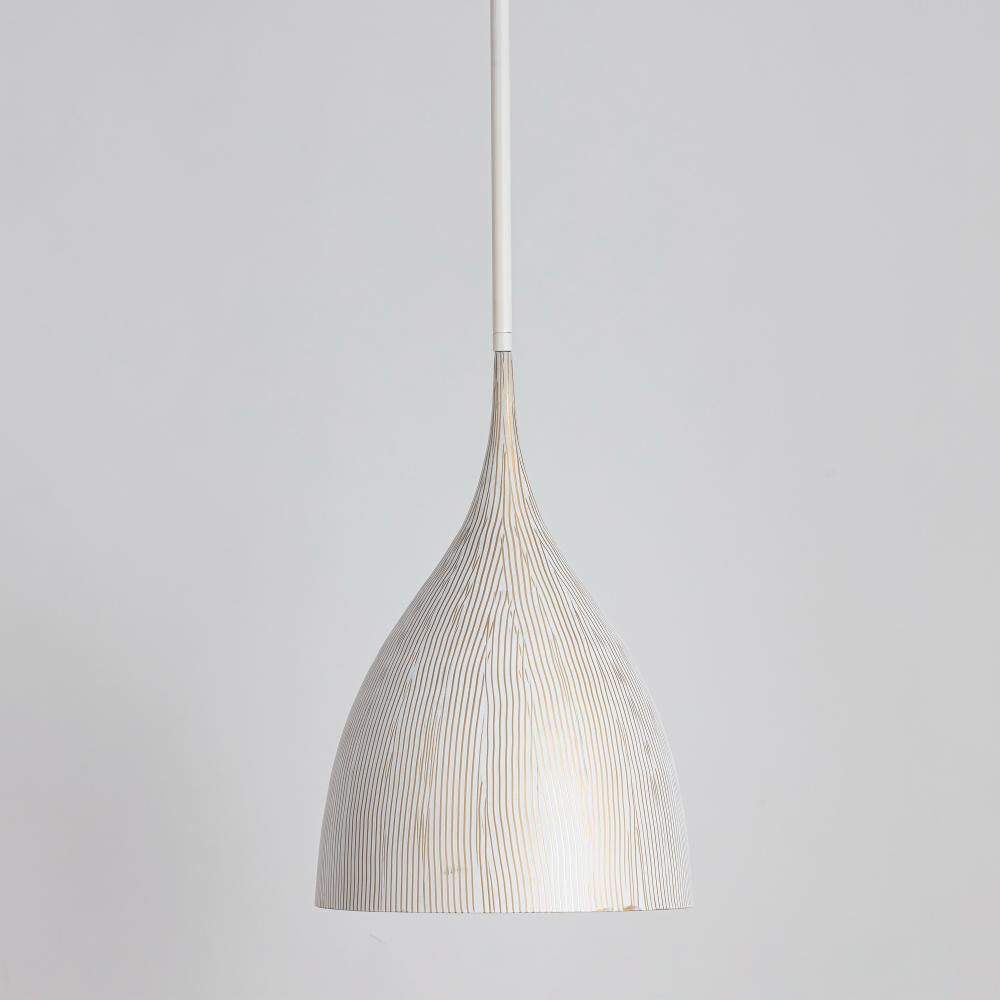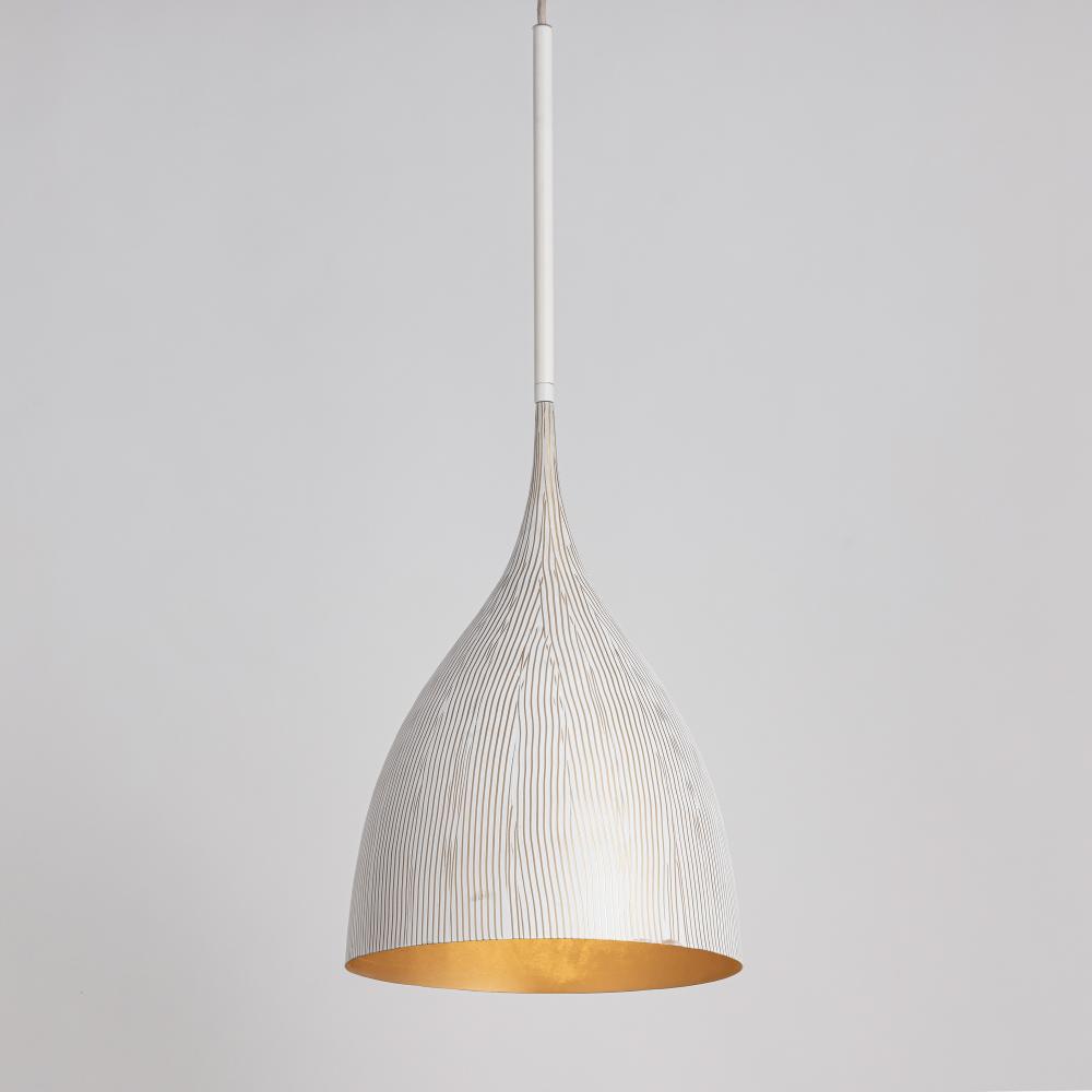 Graceful and sculptural, Fleur's gently flared silhouette brings a sense of quiet sophistication to any space. Hand-spun metal shades are adorned with a striated finish, scraped by hand to reveal glowing Gold undertones beneath layers of Matte Black or