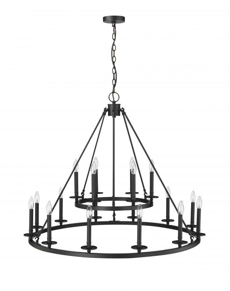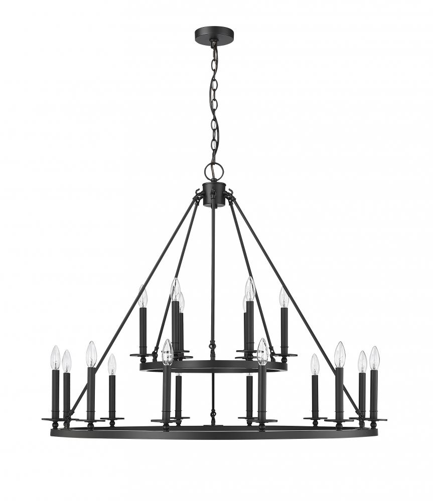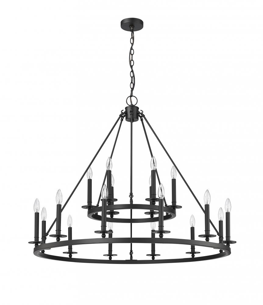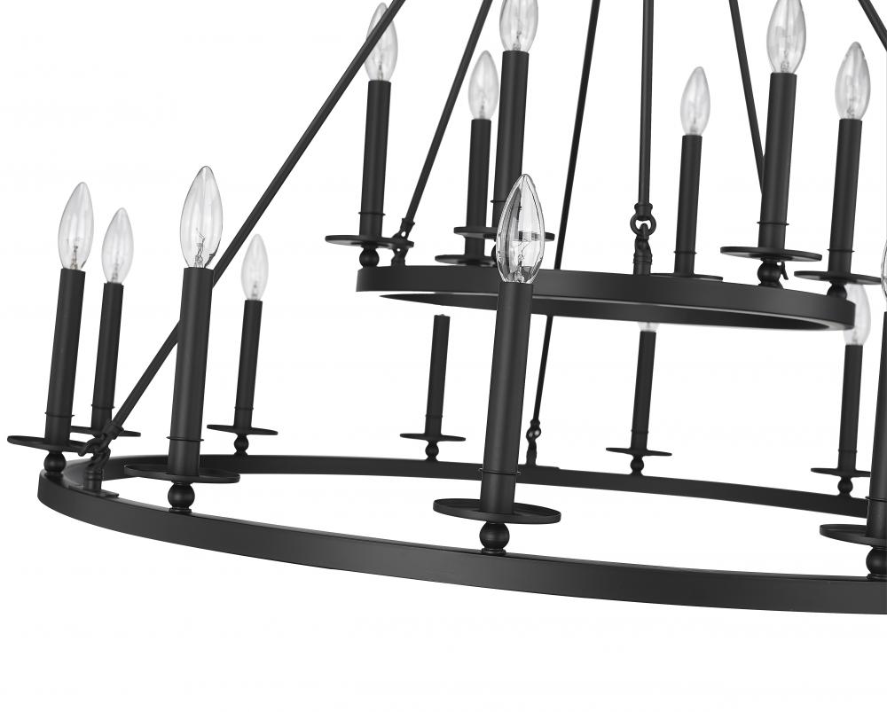 This modern eighteen-light two tier wagon wheel chandelier uses a candelabra bulb base with 60 watts per bulb.