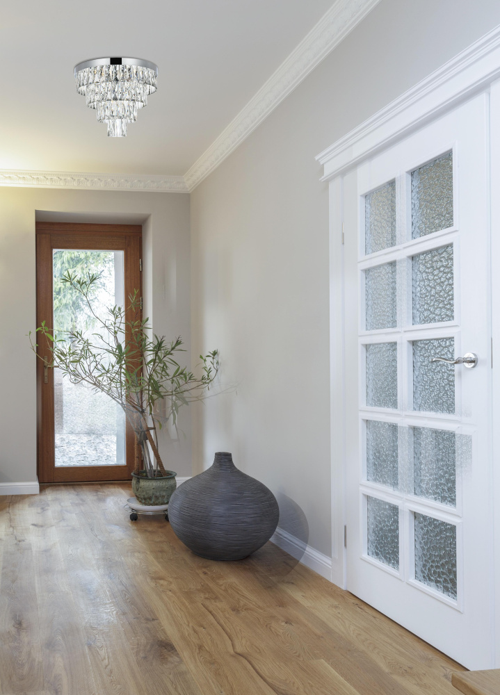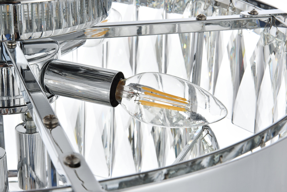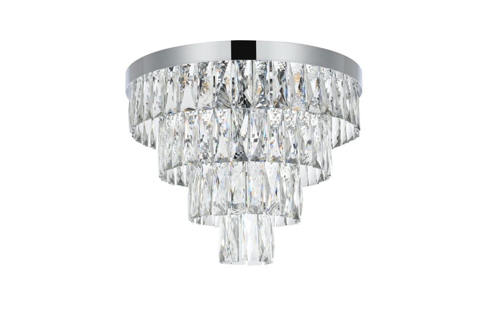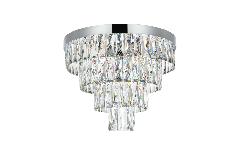 Transform your space with this extraordinary flush mount that reimagines classical crystal design for contemporary interiors. The masterfully engineered silhouette features four graduating tiers that create a spectacular inverted pyramid, reminiscent of a frozen cascade captured in mid-descent. Each precisely cut rectangular crystal is strategically positioned to maximize light play, creating mesmerizing displays of fractured light throughout your space. The substantial scale makes this fixture an ideal centerpiece for bedrooms, closets, hallways, sophisticated dining rooms, or executive offices. The thoughtful construction incorporates six light sources distributed throughout the tiers, ensuring both spectacular illumination and enchanting crystal animation. The robust iron framework provides a secure foundation while maintaining visual lightness, allowing the crystals to appear as if floating in space. Available in reflective chrome, sophisticated black, or warm satin gold, this flush mount makes an unforgettable statement while maintaining refined restraint. The cascading arrangement creates a sense of movement and flow, while the geometric precision of each crystal adds contemporary edge to the classical form. This is more than a light fixture – it's an architectural feature that transforms your space through its commanding presence and spectacular light performanc