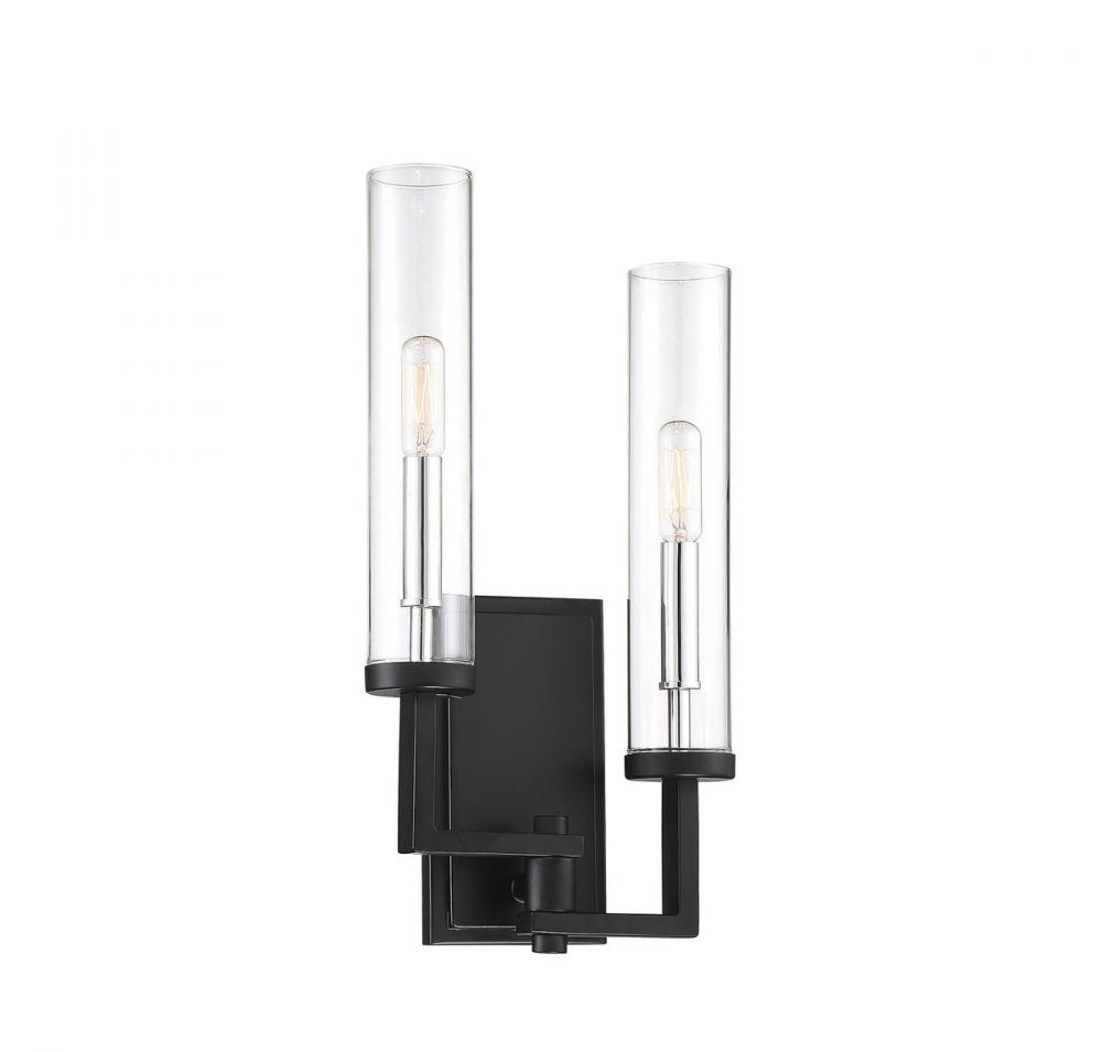 Talk about versatility! The matte black finish and chrome accents of the Savoy House 2-light wall sconce go with everything and the clean, timeless design looks terrific with many decor styles. The slim, tubular clear glass shades around two 60W candelabra size bulbs pair nicely with the branching arms. The overall effect is symmetrically satisfying and adds stylish illumination to your room’s layered lighting.