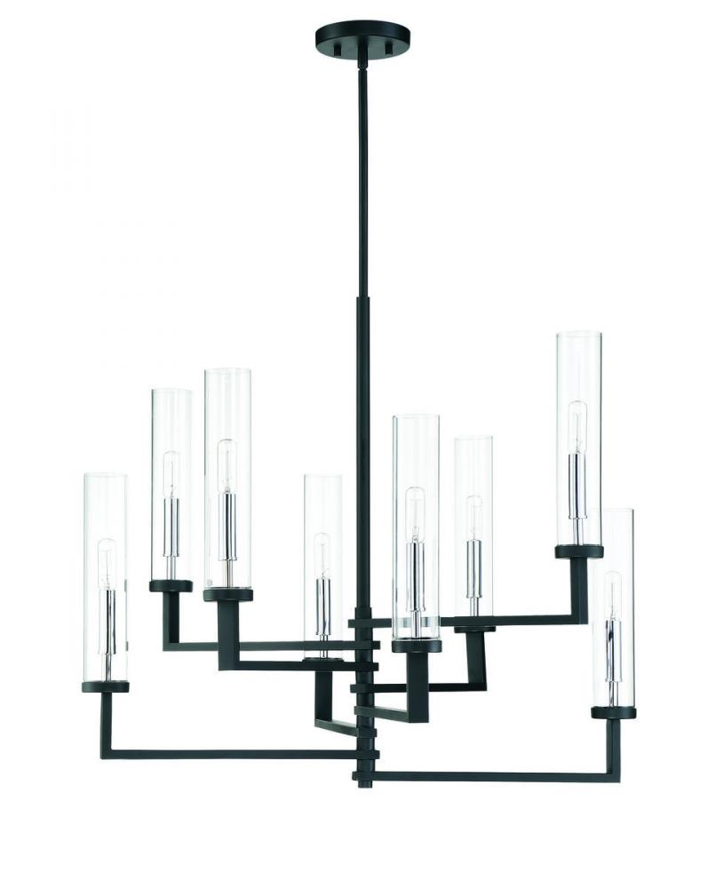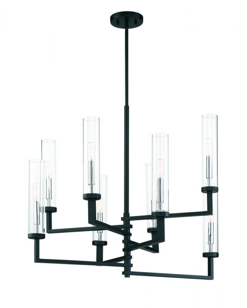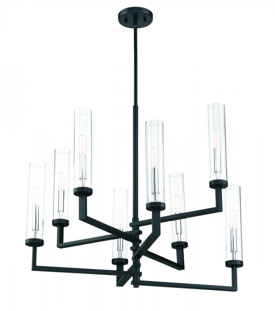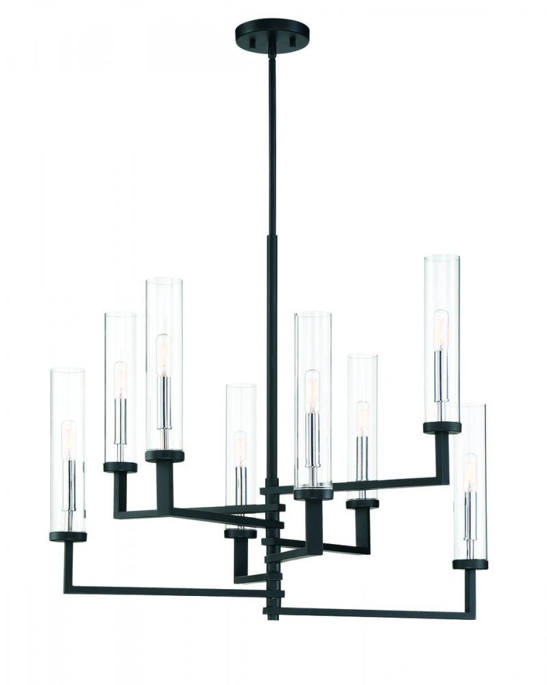 This Savoy House Folsom 8-light chandelier has a clean and versatile look that pairs well with so many decor styles! It features adjustable arms topped with slim tubular shades of clear glass and a bold two-tone finish of matte black with polished chrome. Folsom is 25" in height and 28.38" in width. It uses 8 candelabra size bulbs of up to 60 watts per bulb.