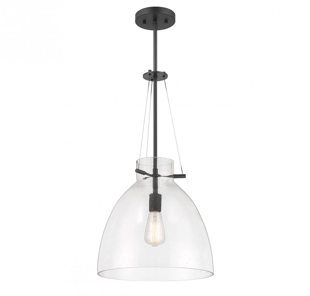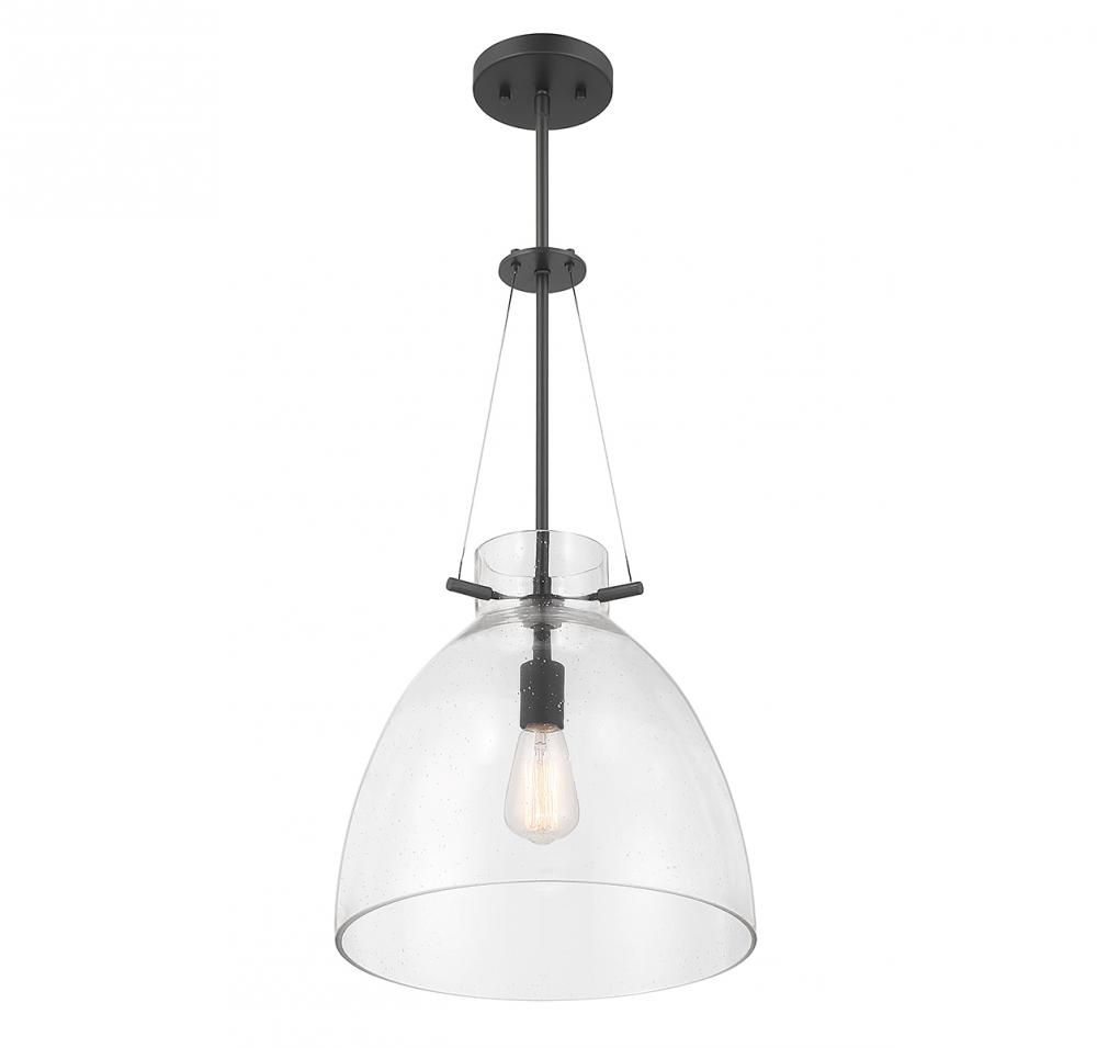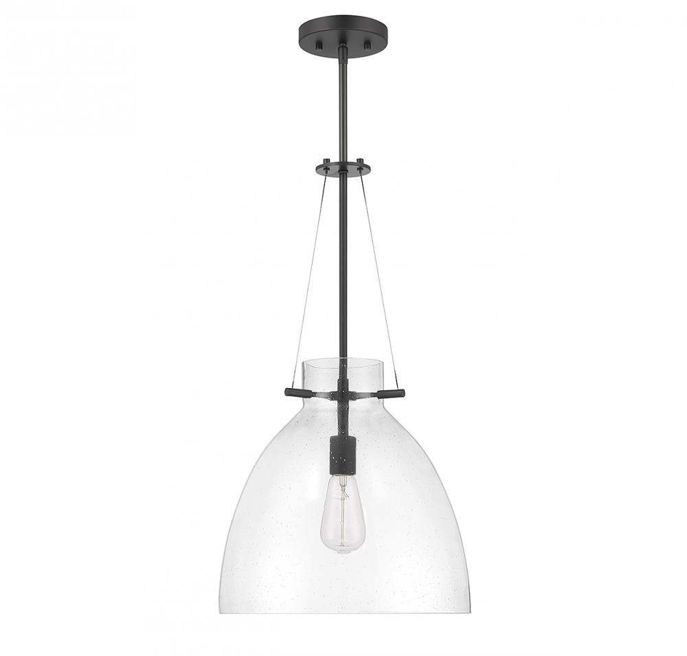 The Savoy House Foster 1-light pendant is the perfect way to add a sleek look to any space. Its large shade of clear seeded glass has a pleasantly curving shape and pairs nicely with the matte black finish. Foster is 25.50" in height and 14" in width. It uses 1 standard size bulb with a max of 60 watts (bulb not included). Comes with four 12" downrods and one 6" downrod.