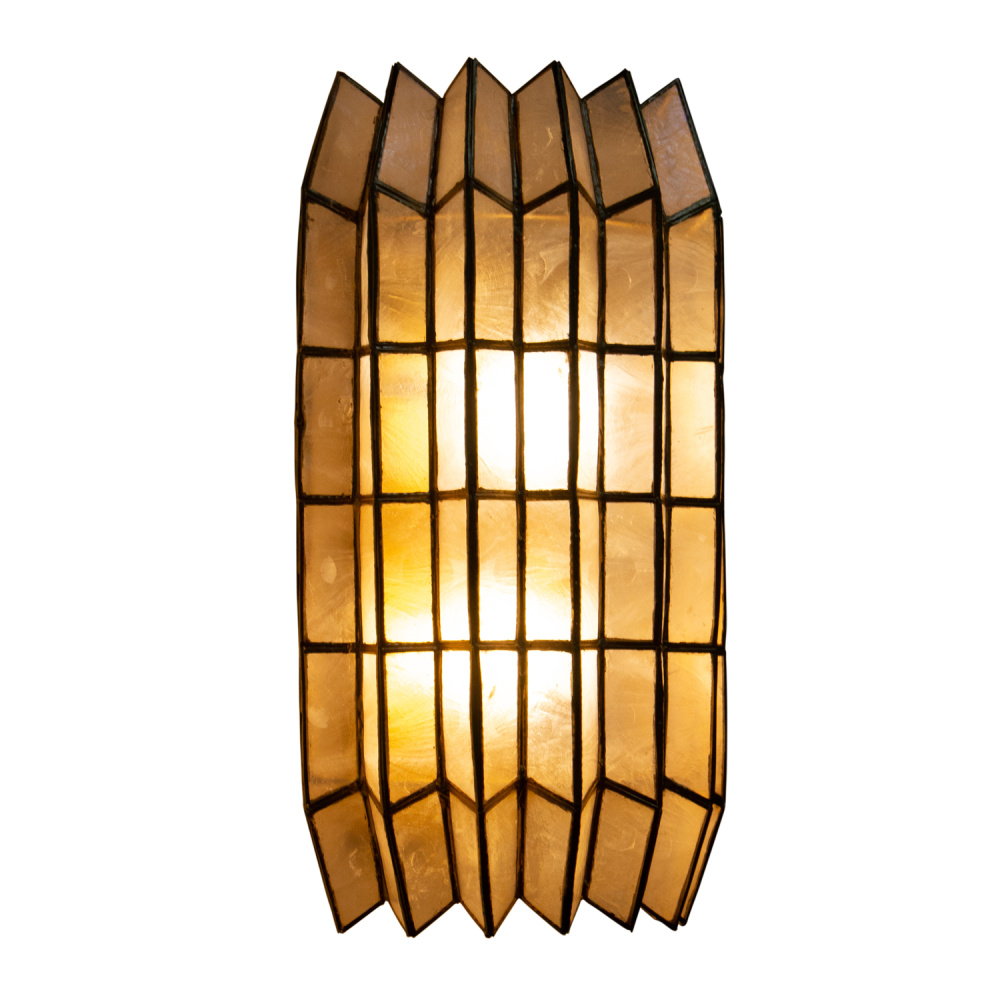 Drawing inspiration from origami, geometric designs, and the natural elegance of crystal cuts, the Fractal collection showcases a captivating zig-zag frame pattern mirrored in the capiz shade’s form. It emanates a gentle, warm glow that beautifully highlights its intricate design and understated shape. The piece is completed with a hand-applied Oxidized Gold Leaf (OL) finish, adding a touch of refined artistry.