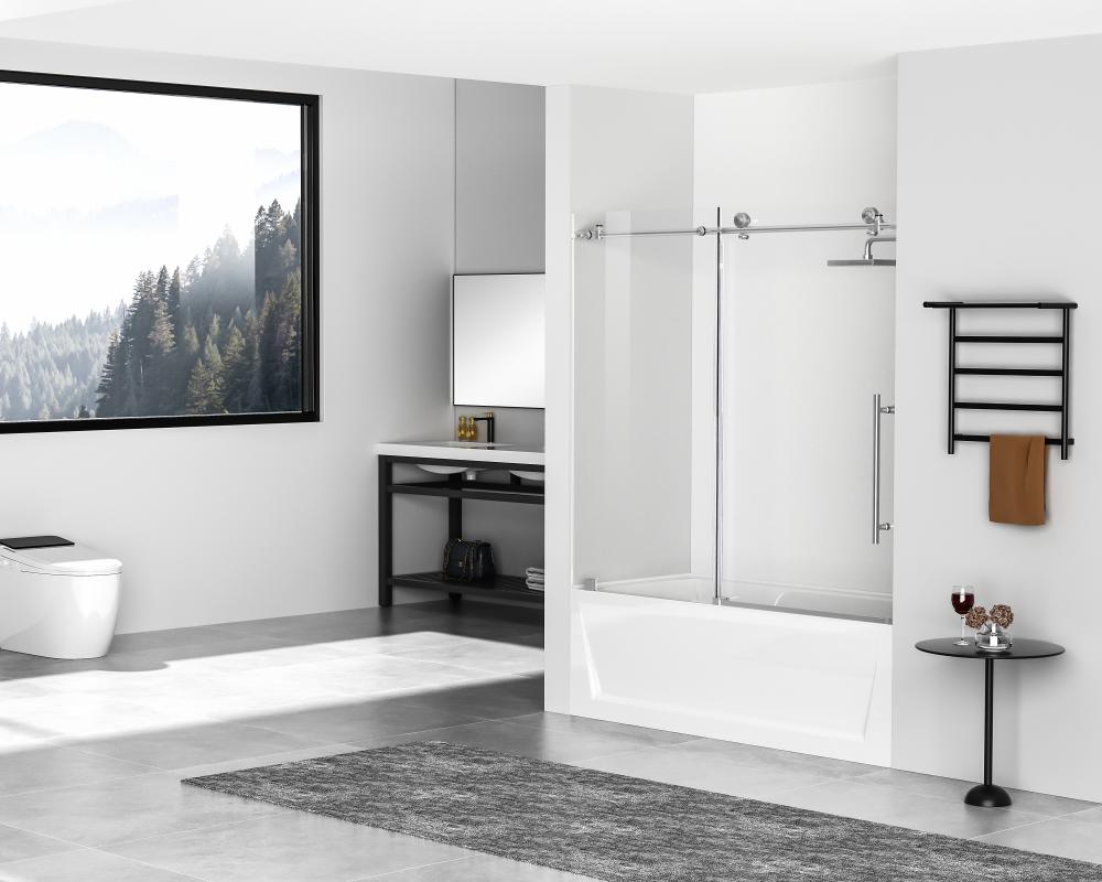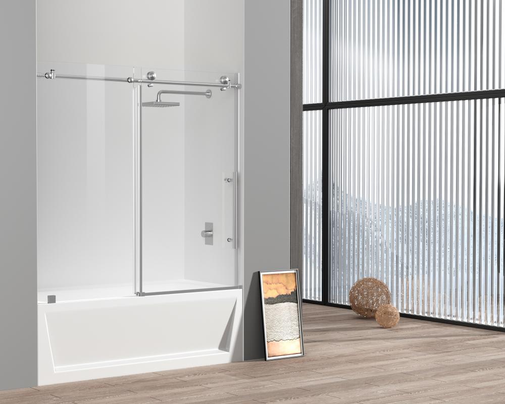 Transform your bathroom into a luxurious oasis with our stunning modern shower tub doors! Our doors are designed to offer both functionality and style, making your shower experience more enjoyable and comfortable. Crafted from high quality materials, our shower tub doors are not only durable but also easy to maintain, making them a practical and long lasting additional to any bathroom. We have four finishes available to choose from to help complement your bathroom décor and aesthetics. Frameless sliding one tub door with 56" - 60" width adjustment range, cut the rails to size. Full length shower door seal thresholds are included to prevent any leaks. Anti-jump mechanism included to ensure safe and smooth door operation.