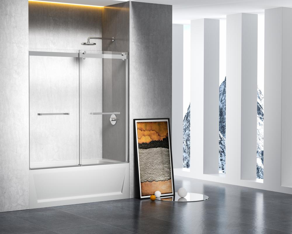 Transform your bathroom into a luxurious oasis with our stunning modern shower tub doors! Our doors are designed to offer both functionality and style, making your shower experience more enjoyable and comfortable. Crafted from high quality materials, our shower tub doors are not only durable but also easy to maintain, making them a practical and long lasting additional to any bathroom. We have four finishes available to choose from to help complement your bathroom décor and aesthetics. Semi-frameless double sliding tub door with 56" - 60" width adjustment range, cut the rails to size. Full length shower door seal thresholds are included to prevent any leaks. Anti-jump mechanism included to ensure safe and smooth door operation.
