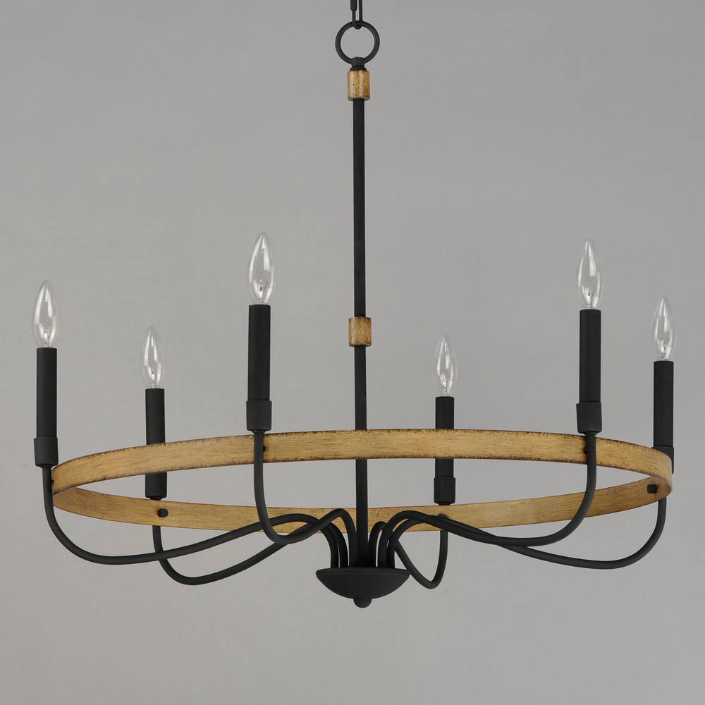 Rustic charm in an elegant, yet simple chandelier with warm distressed wood finishes and textured black metal arms. Black candle covers evoke wax candles to complete the classic and transitional appeal of this series. The flush mount features a satin white