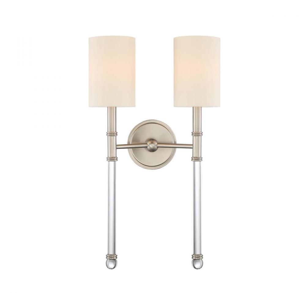 Slim and stylish! The Savoy House Fremont sconce packs a whole lot of textural interest into a slender silhouette. The round wall plate and light arms have double ring detailing and a satin nickel finish. The long tail of these arms are made of clear glass with another double ring above the glass ball finials. The cylindrical shades are a lovely, soft white fabric. Altogether, it’s an elegant fixture that is a pleasure to have in your home. Two 60W candelabra size bulbs fit within the shades of this 13" wide and 21" high sconce. It’s the perfect size to place alone or in groups along the walls of your dining room, kitchen, living room, entryway, bedroom, bathroom, office, family room, media room or hallway.