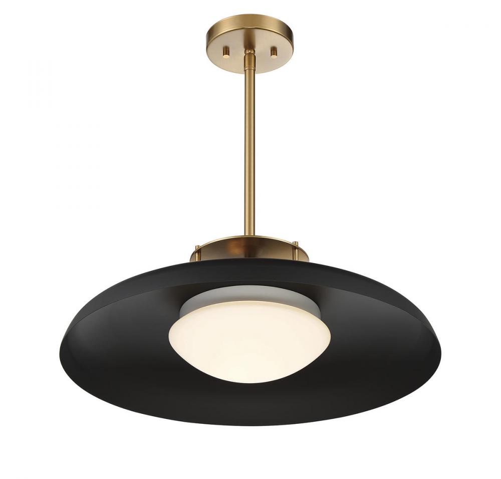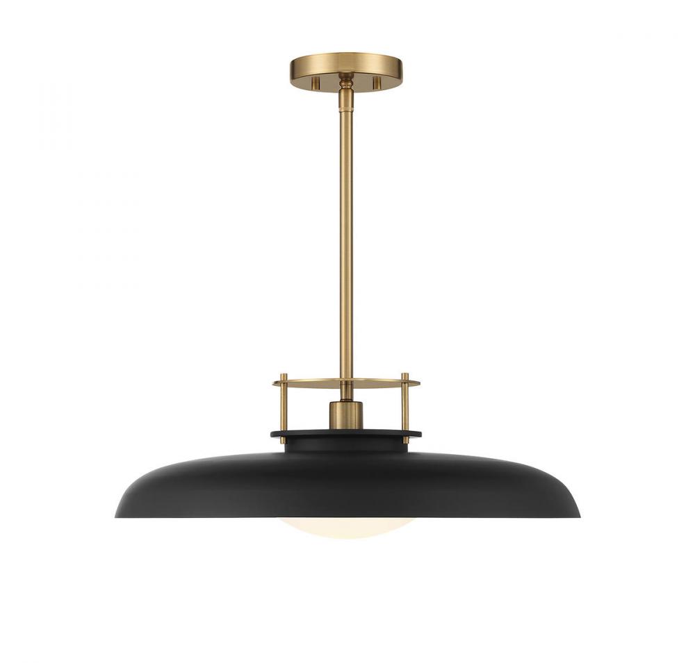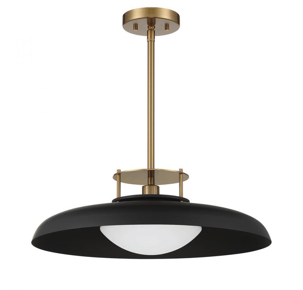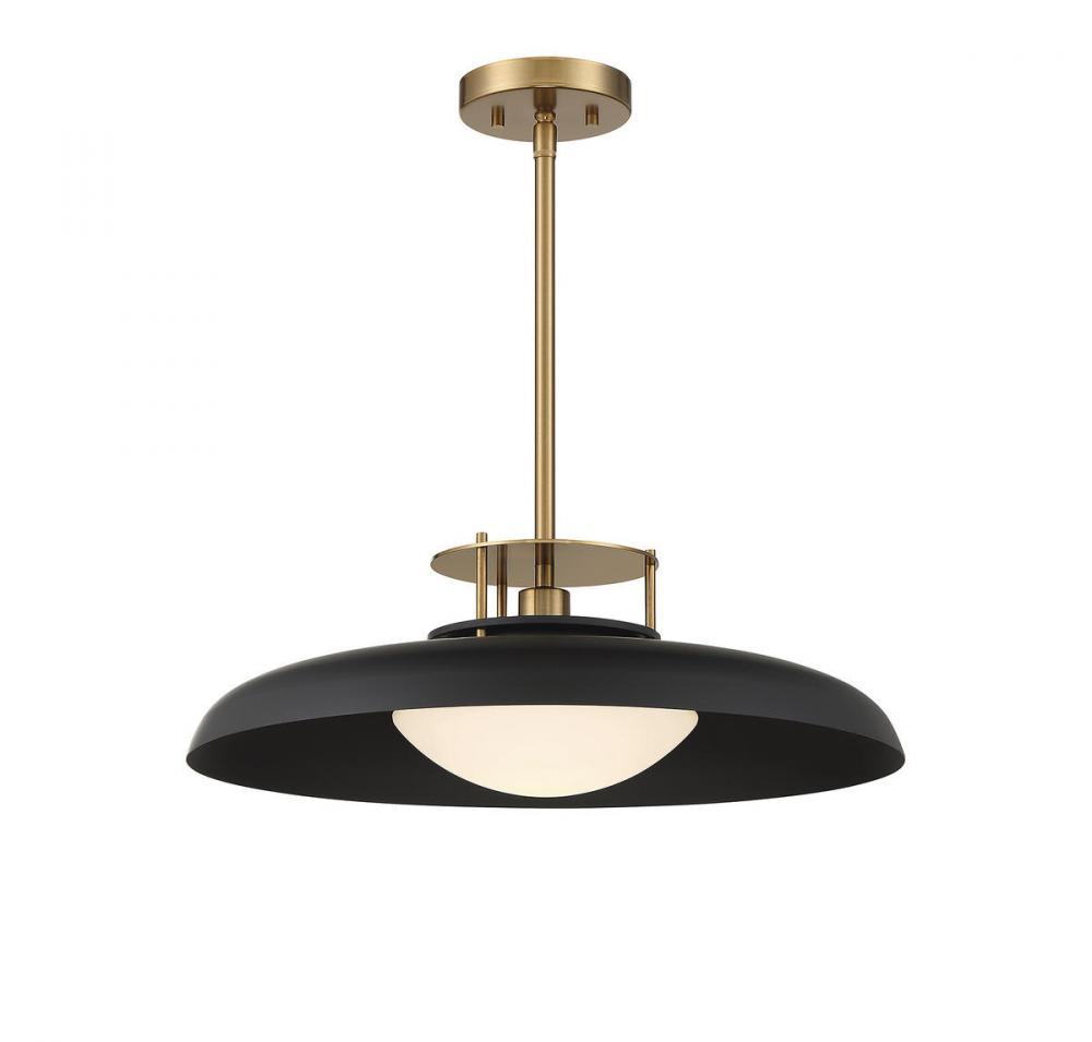 This Savoy House Gavin 1-light pendant brilliantly combines vintage and midcentury modern style touches to create a thoroughly modern take on illumination. Gavin uses an opal glass shade and a wide metal shade to soften and direct the light. Finished in matte black with warm brass accents. Gavin is 20" in width and has an adjustable height ranging from 14" to 60". It uses one standard size bulb of up to 60 watts. Comes with four 12" downrods and one 6" downrod, plus 80" of cord.
