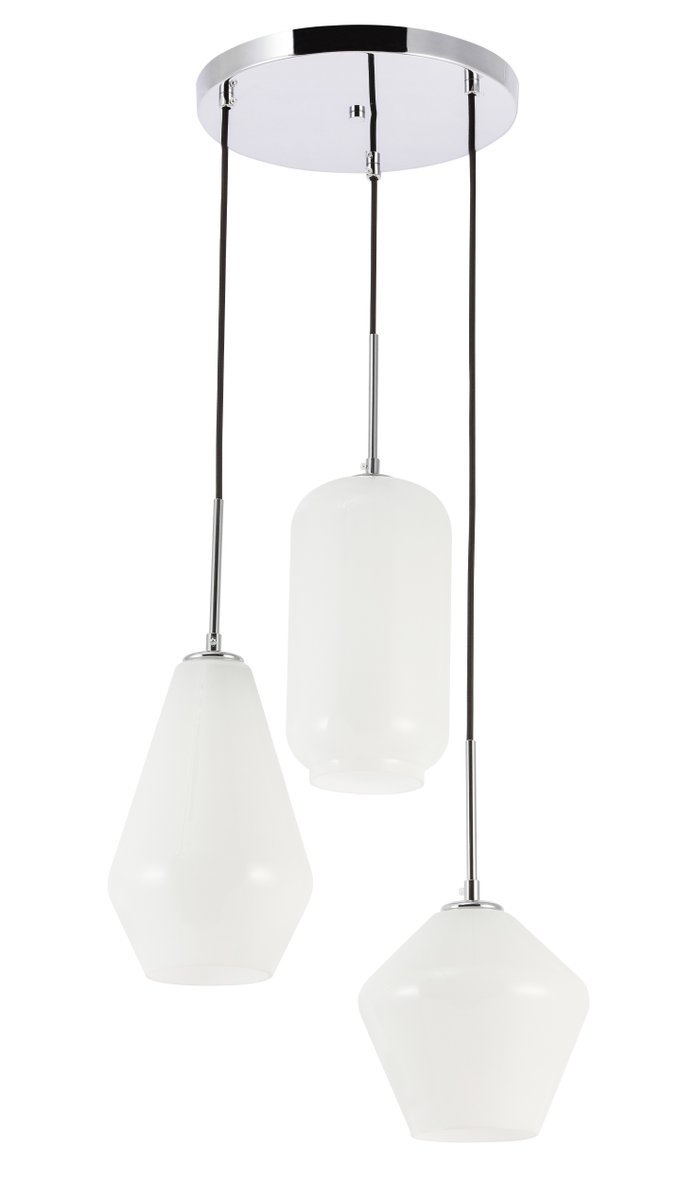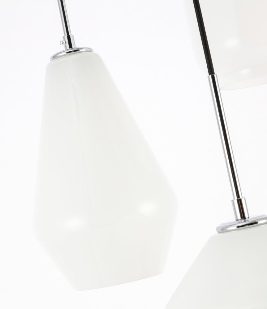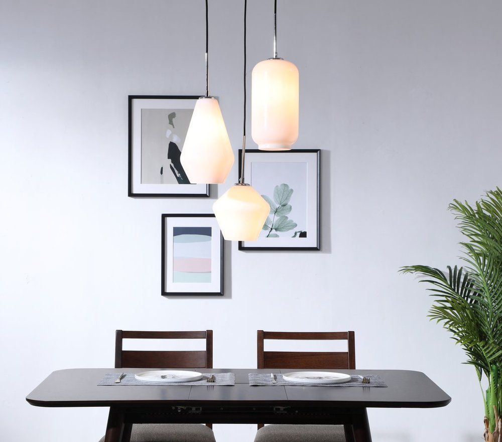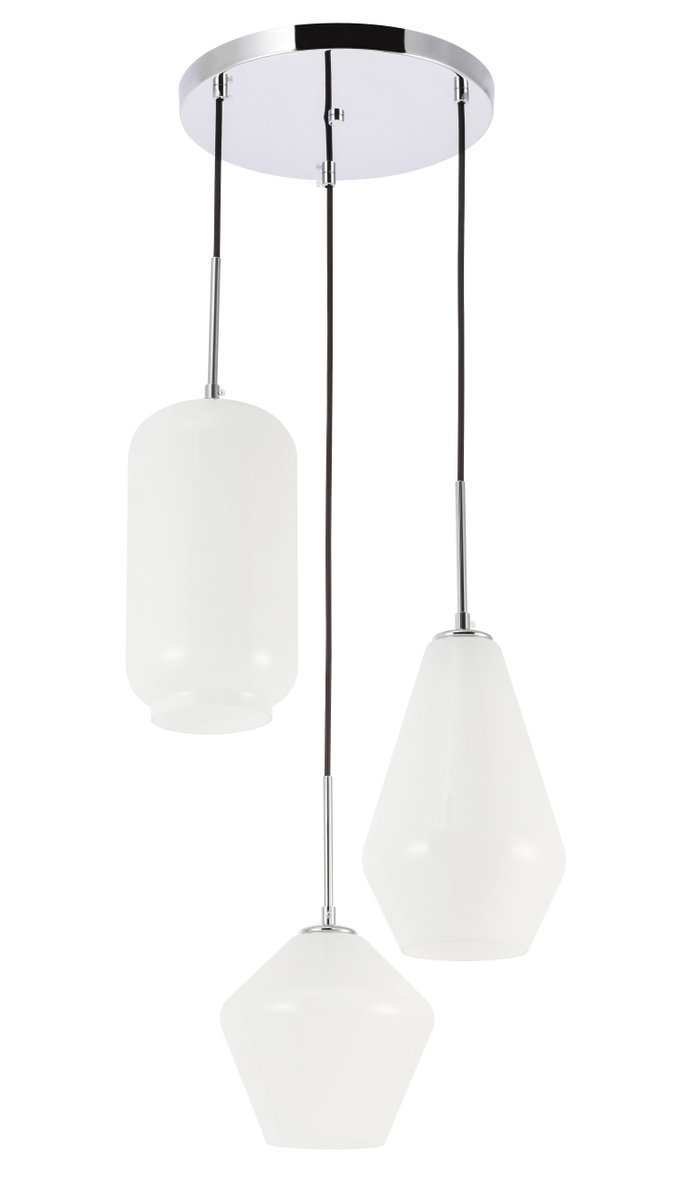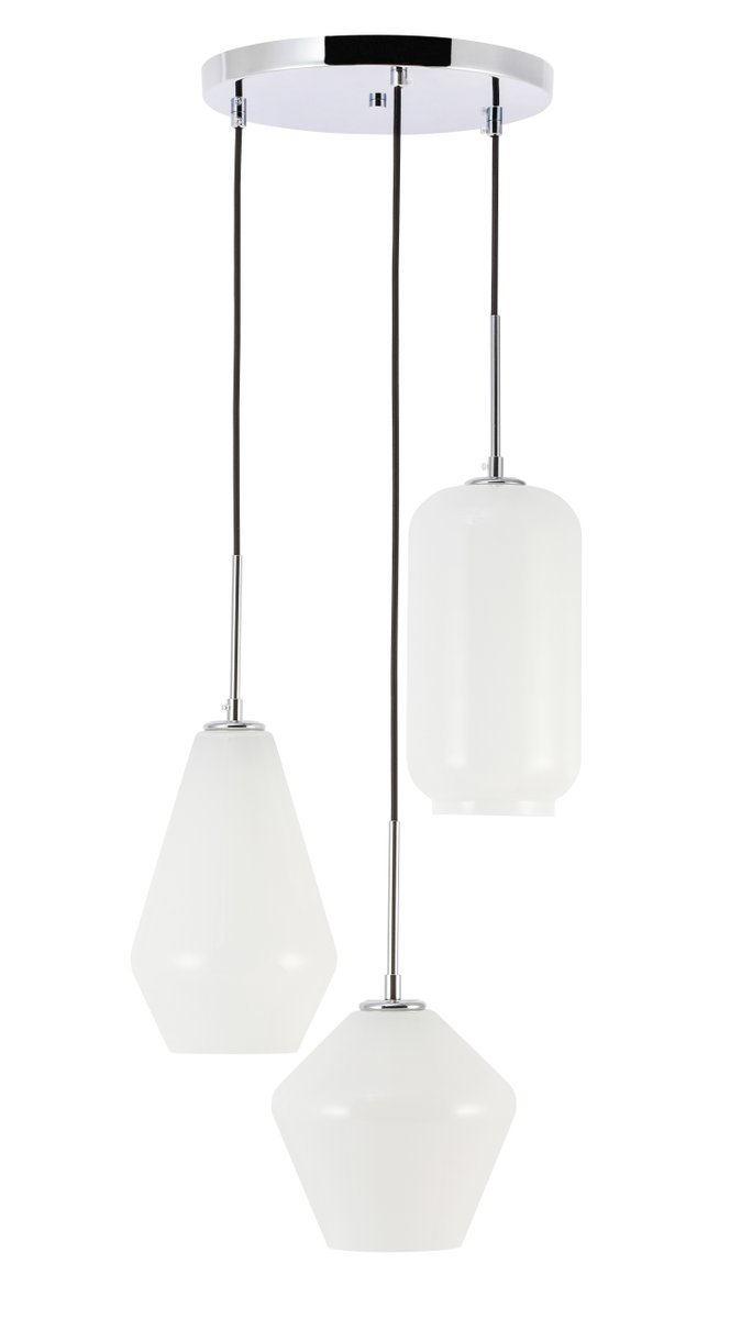 The Gene Collection of lights will be sure to have your guests admire your modern sense of style with the beautiful simplicity of its shape and form. The canopy supports three pendant lights that can be adjusted to different heights in order to create dramatic levels of lights and shadows. The pendant's clean lines created by the cords and diamond shaped shades makes this the perfect lighting addition to any home that is in need of a chic modern flair. Available in a brass, chrome, or black finish, with either a clear or frosted diamond glass shade, enhance your dining room, living room, or bedroom with the Gene Collection hanging pendant and live in sleek contemporary style (light bulbs not included).