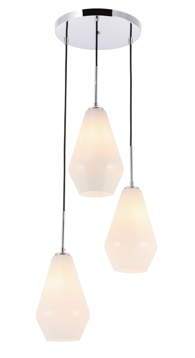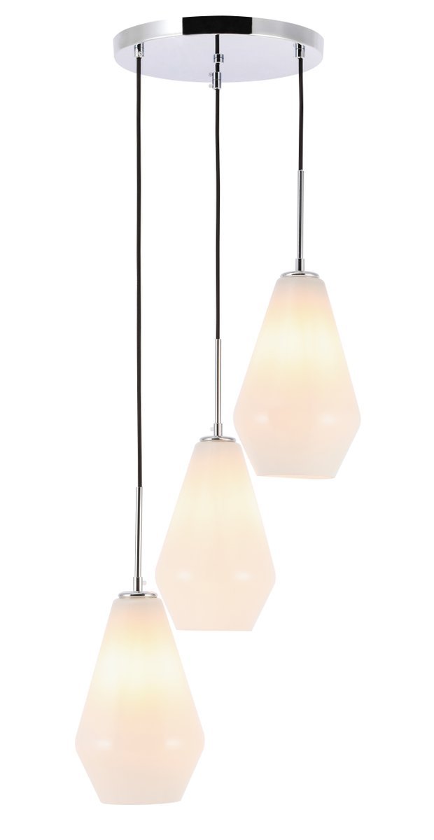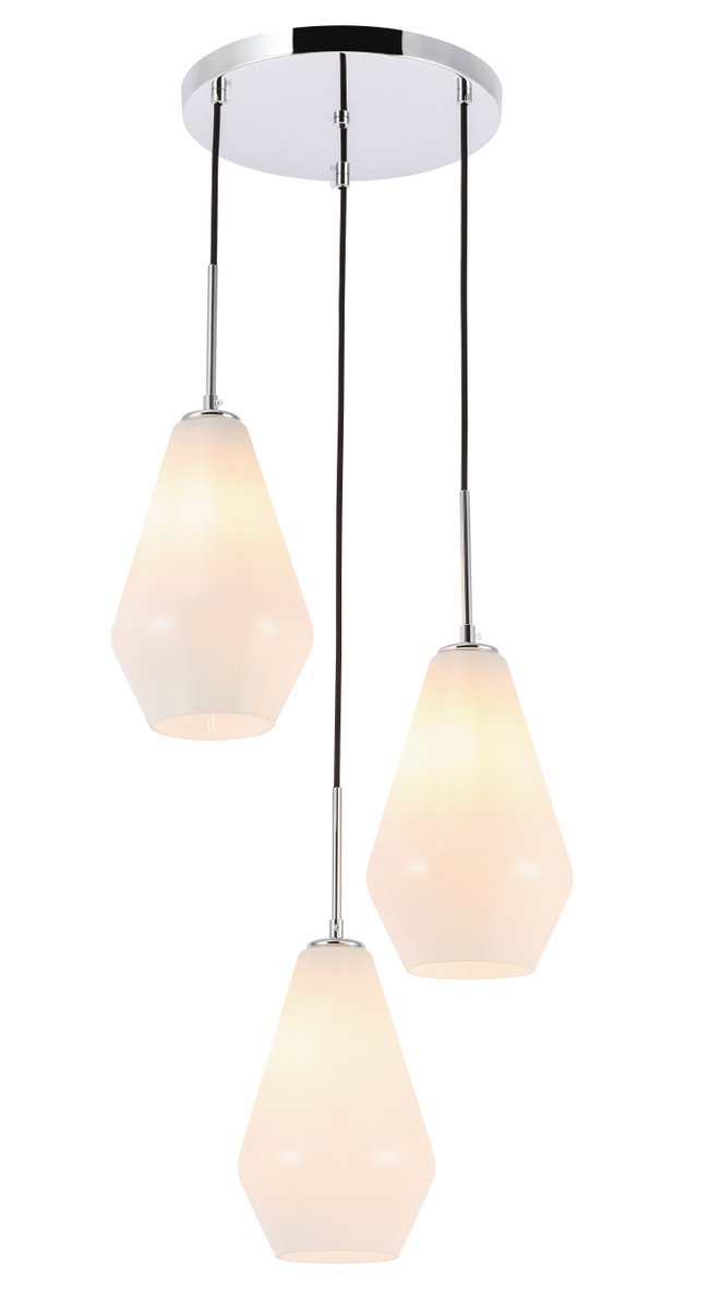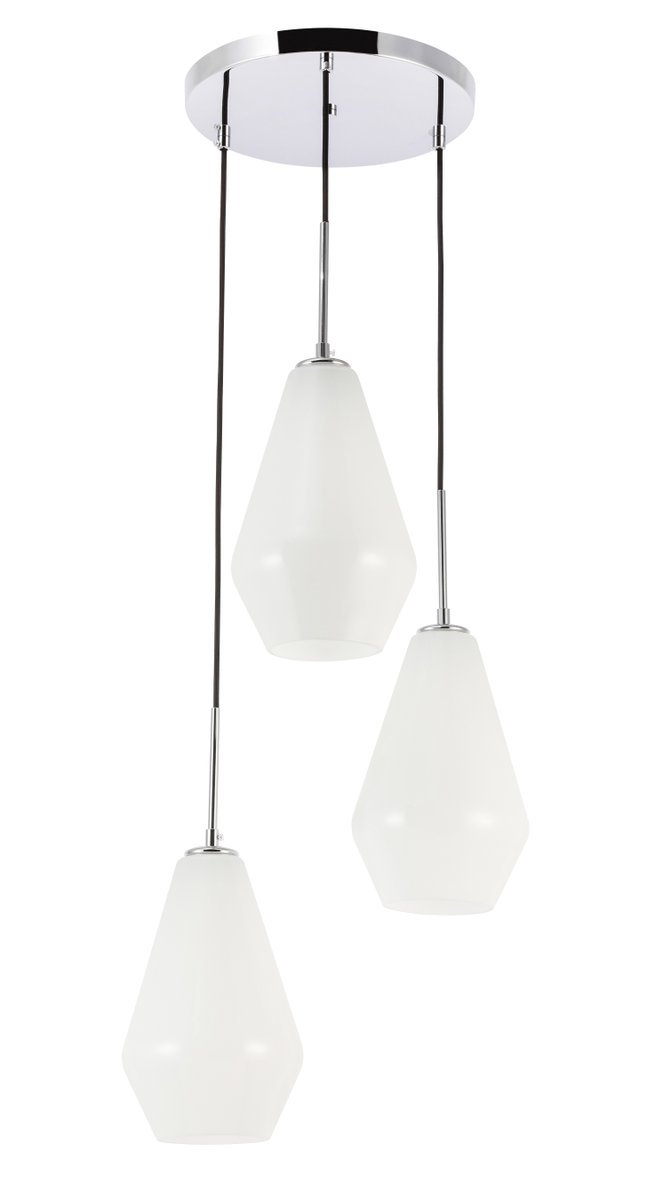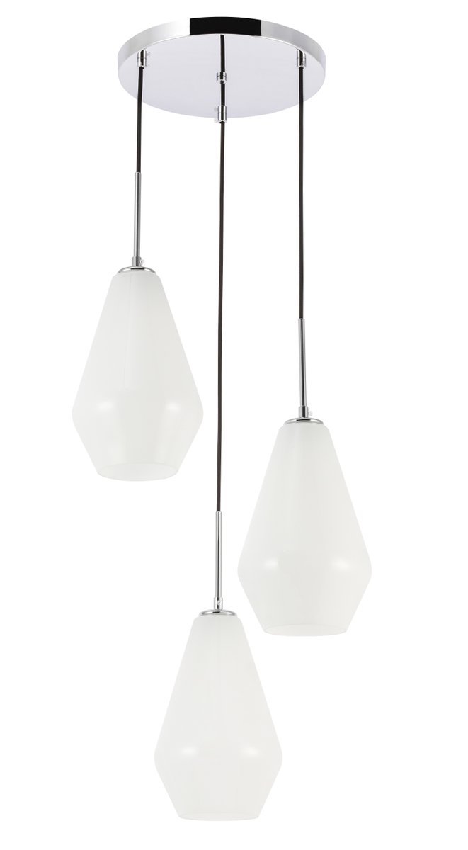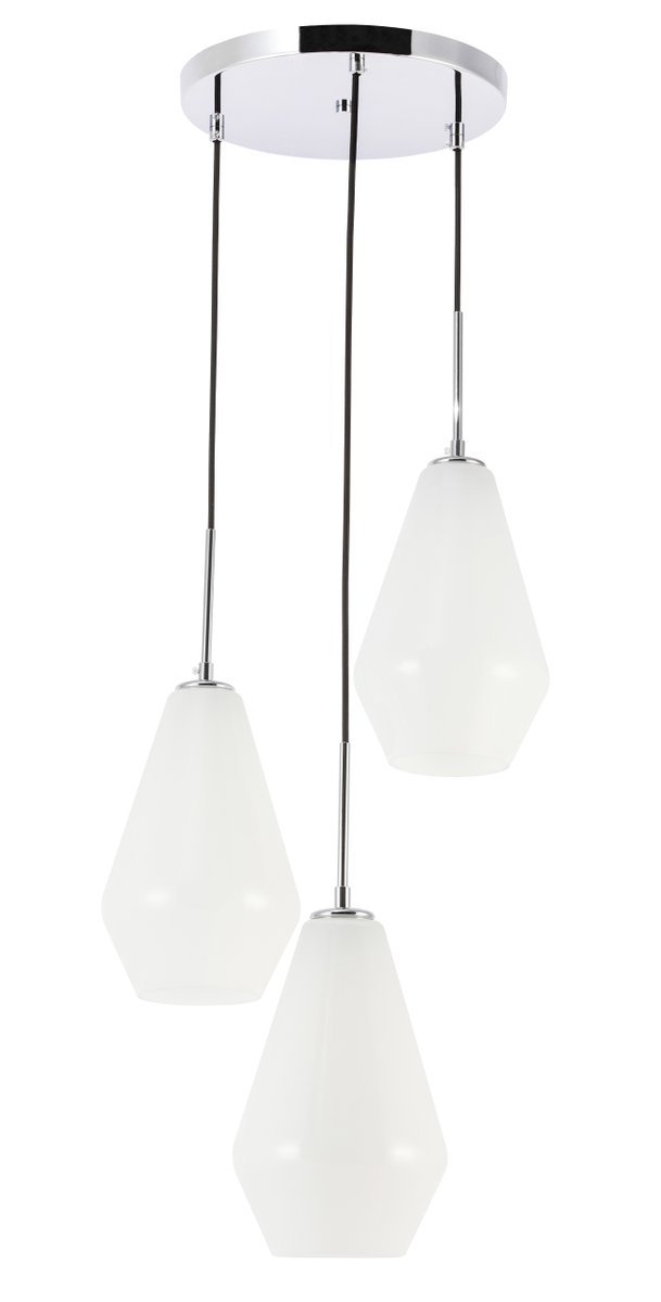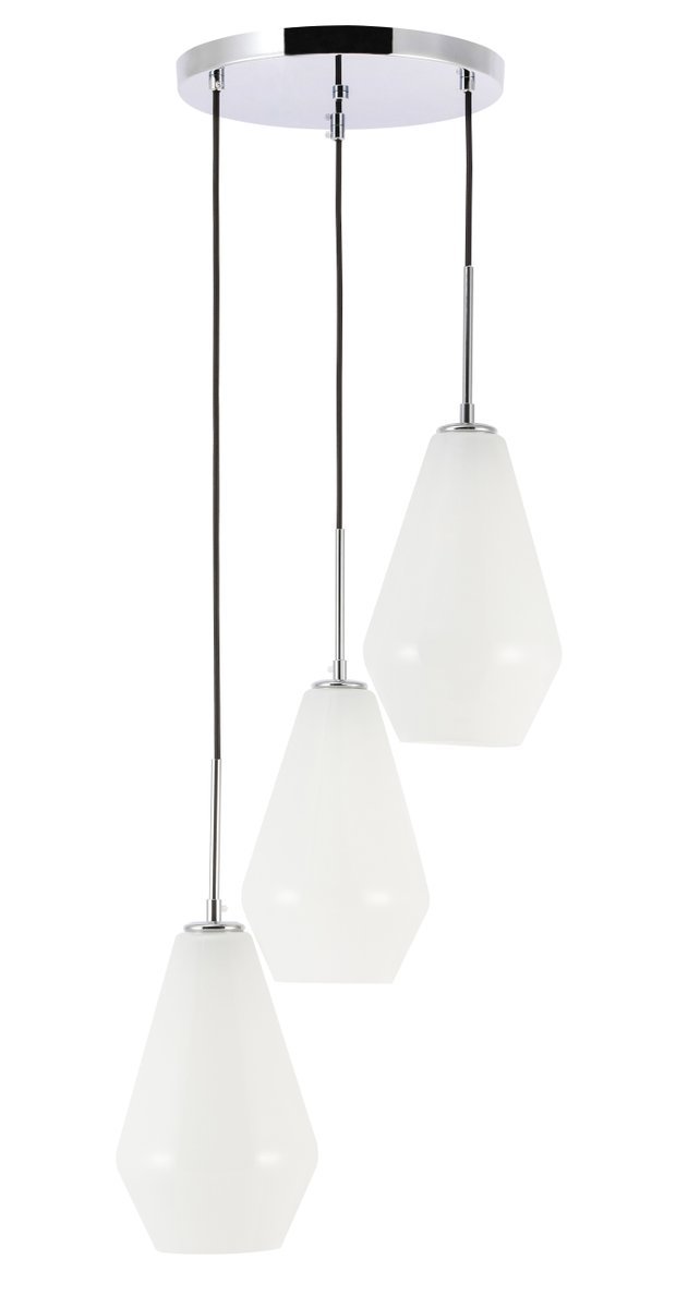 The Gene Collection of lights will be sure to have your guests admire your modern sense of style with the beautiful simplicity of its shape and form. The canopy supports three pendant lights that can be adjusted to different heights in order to create dramatic levels of lights and shadows. The pendant's clean lines created by the cords and diamond shaped shades makes this the perfect lighting addition to any home that is in need of a chic modern flair. Available in a brass, chrome, or black finish, with either a clear or frosted diamond glass shade, enhance your dining room, living room, or bedroom with the Gene Collection hanging pendant and live in sleek contemporary style (light bulbs not included).