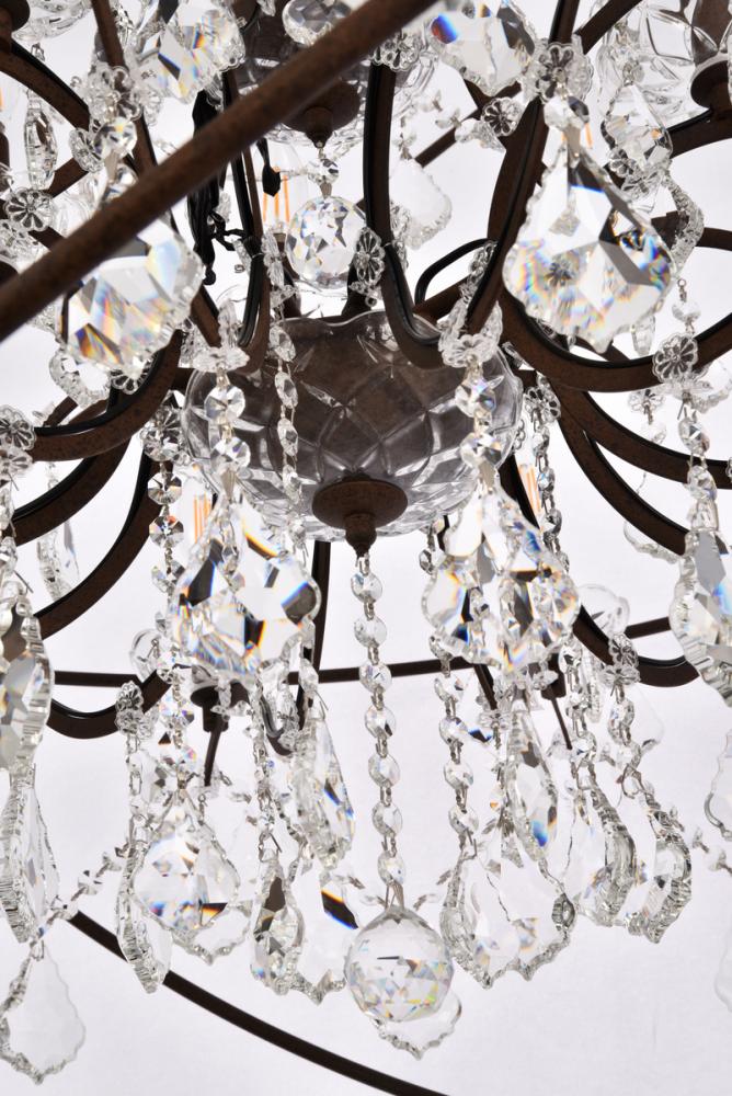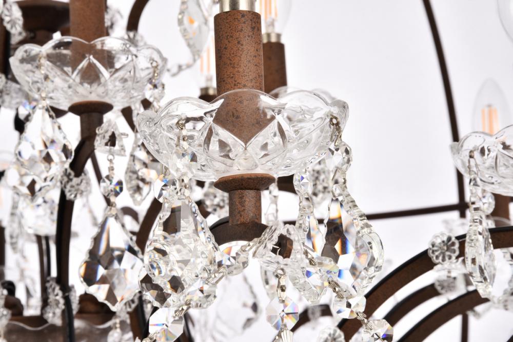 Royal-cut clear crystals and 18 candelabras create a dramatic contrast with the rustic-intent finish