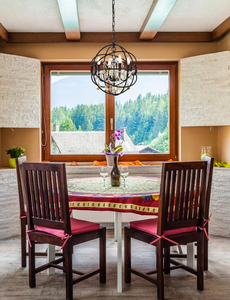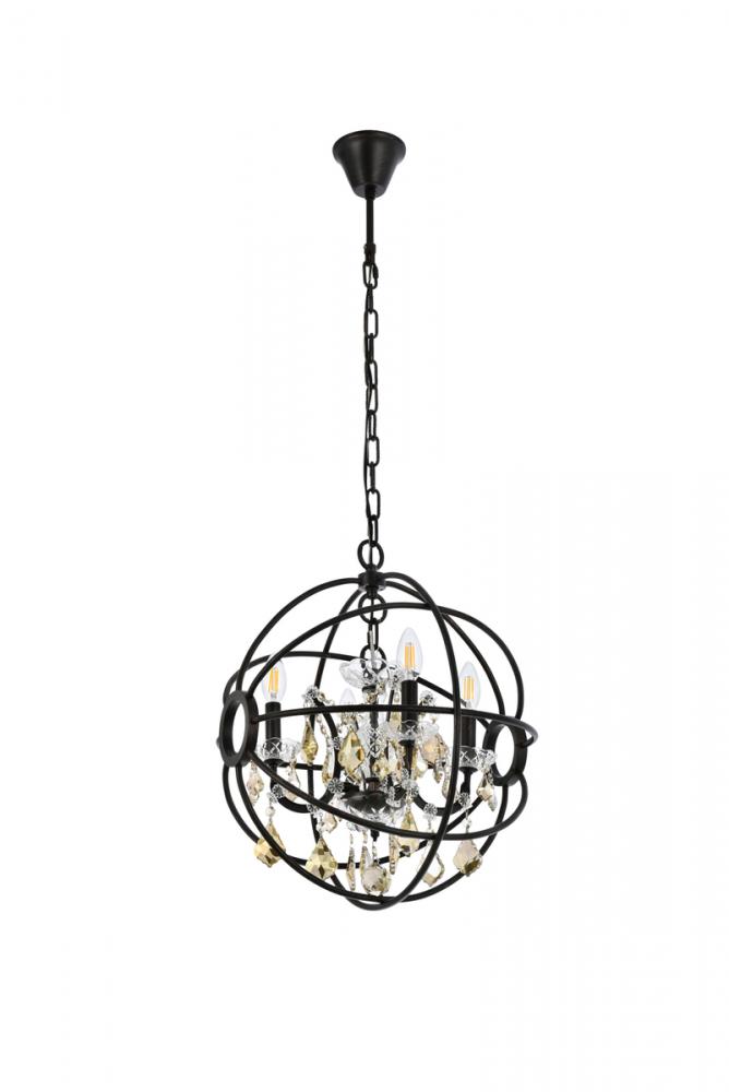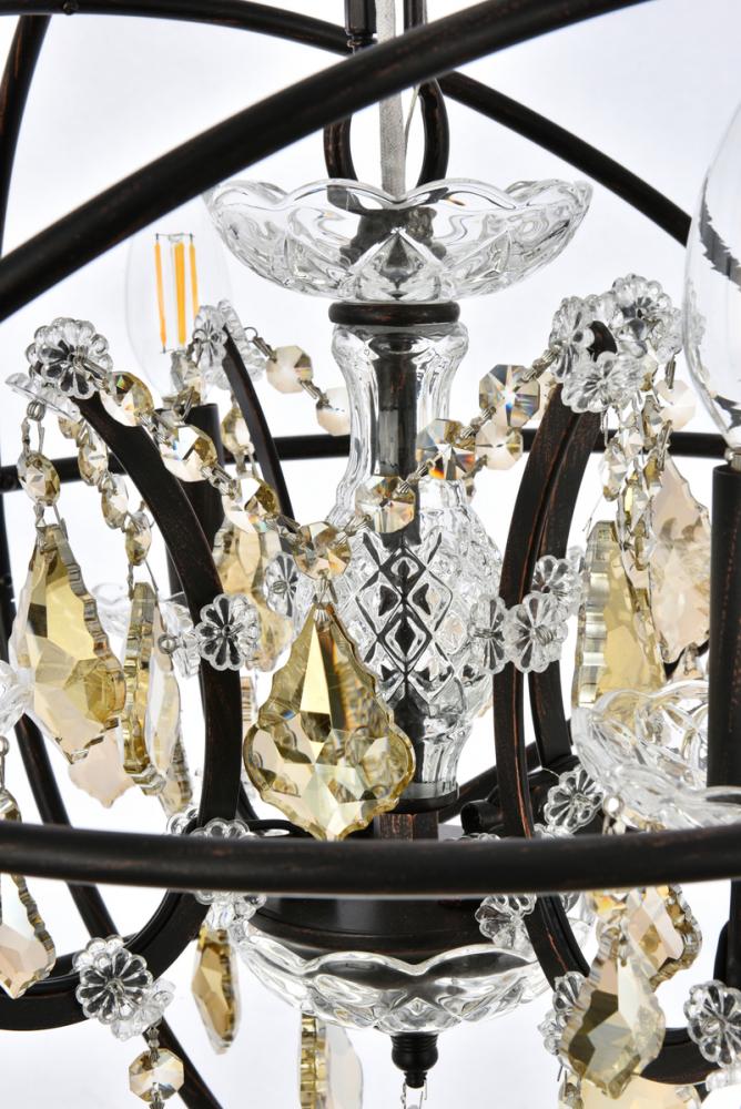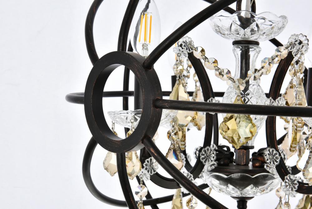Royal-cut golden-teak crystals and four candelabras create a dramatic contrast with the dark-bronze finish