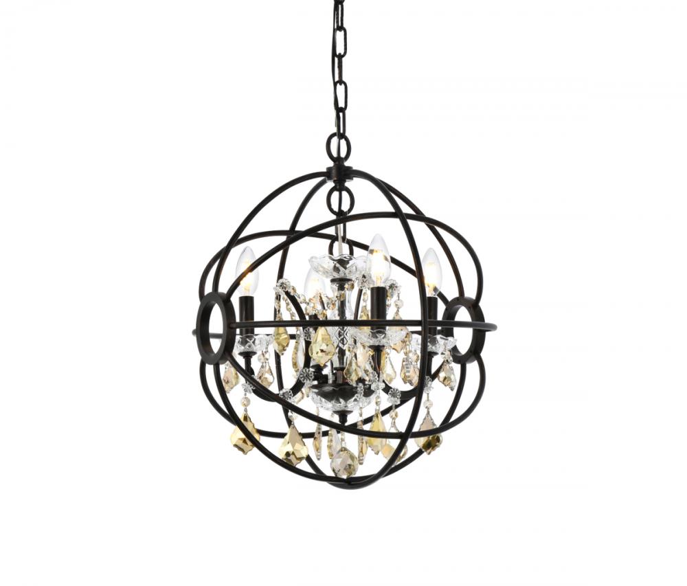 Unique design features a classic crystal pendant lamp suspended in a new age gyroscopic frame
