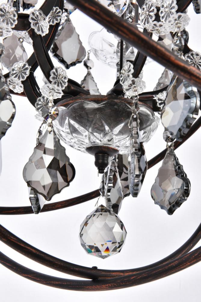 Royal-cut silver-shade crystals and five candelabras create a dramatic contrast with the dark-bronze finish