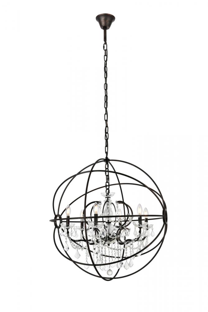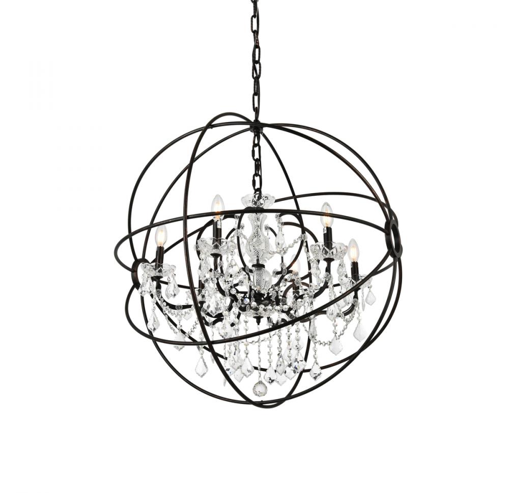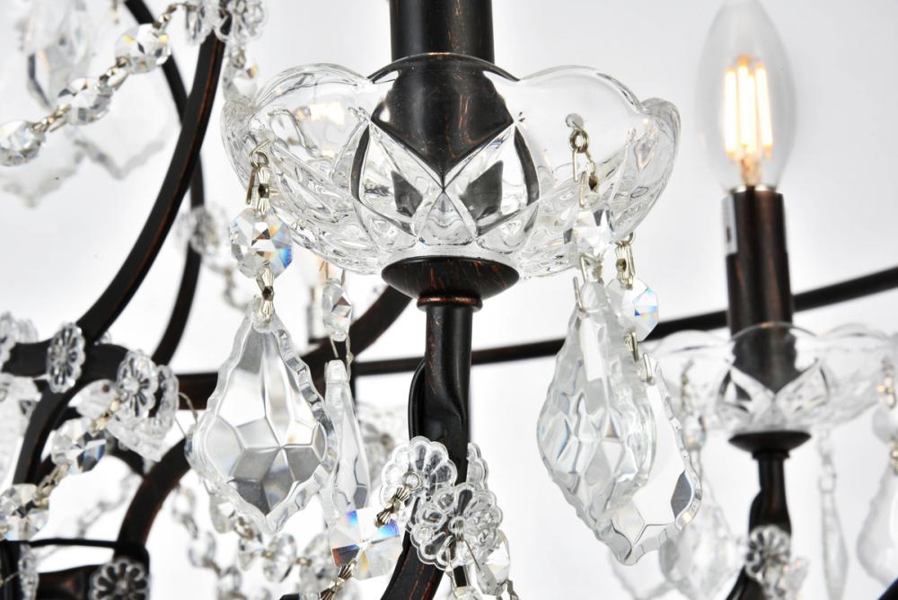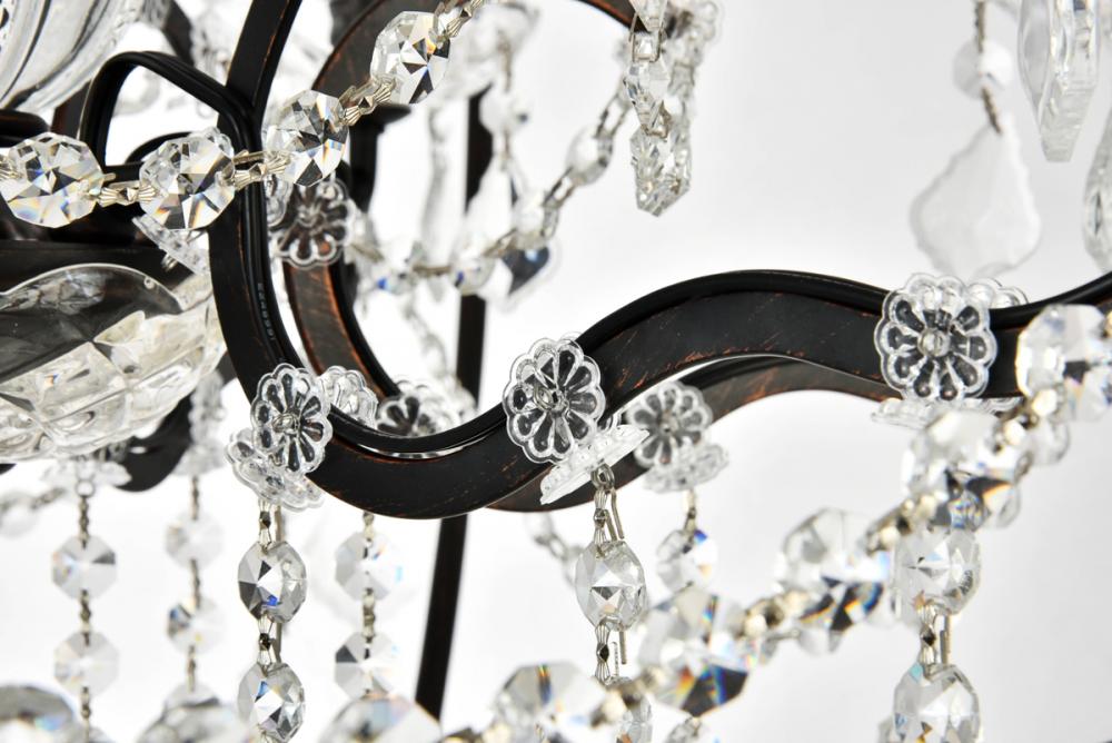 Royal-cut clear crystals and six candelabras create a dramatic contrast with the dark-bronze finish
