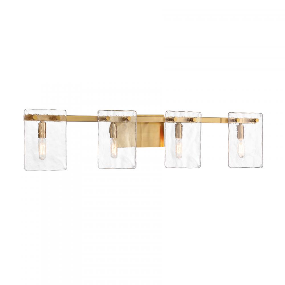 Bring a beautiful ocean-inspired lighting look to your home with the Savoy House Genry 4-light bath bar. It is decorated with rippling panes of handmade glass and finished in Warm Brass. Genry is 7.75" in height, 35" in width and extends 5.5" from the wall. It uses four candelabra size bulbs of up to 60 watts per bulb. Bulbs not included. This bath light is damp area rated and must be installed as shown.
