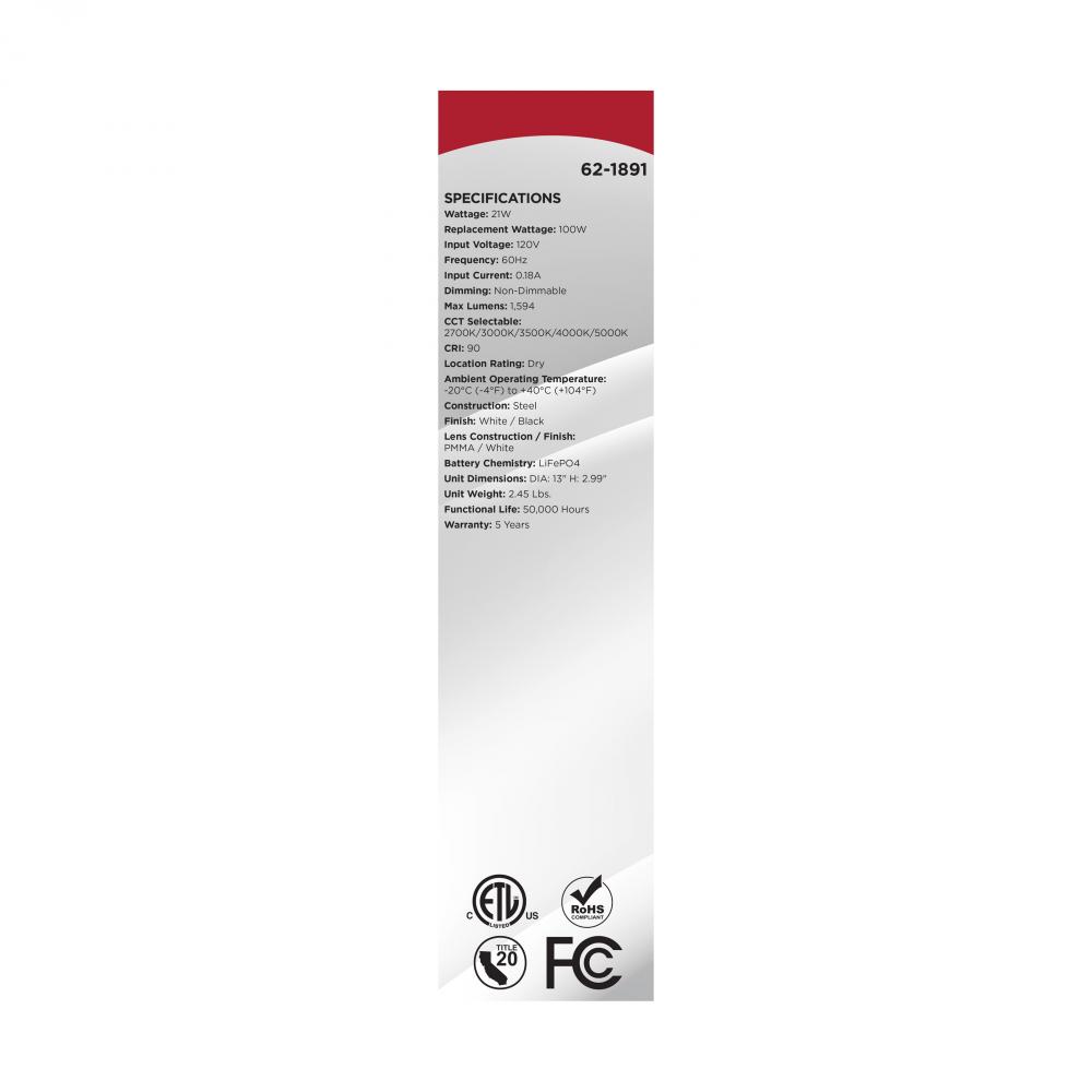The SATCO NUVO 62-1891 13-Inch Glamour LED flush mount fixture in matte black features a built-in emergency battery backup that provides up to 90 minutes of illumination during power outages-offering critical reliability with an elegant design. An integrat