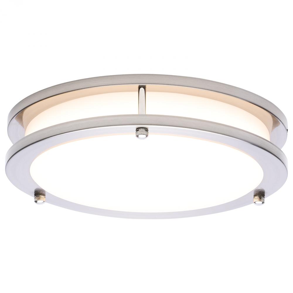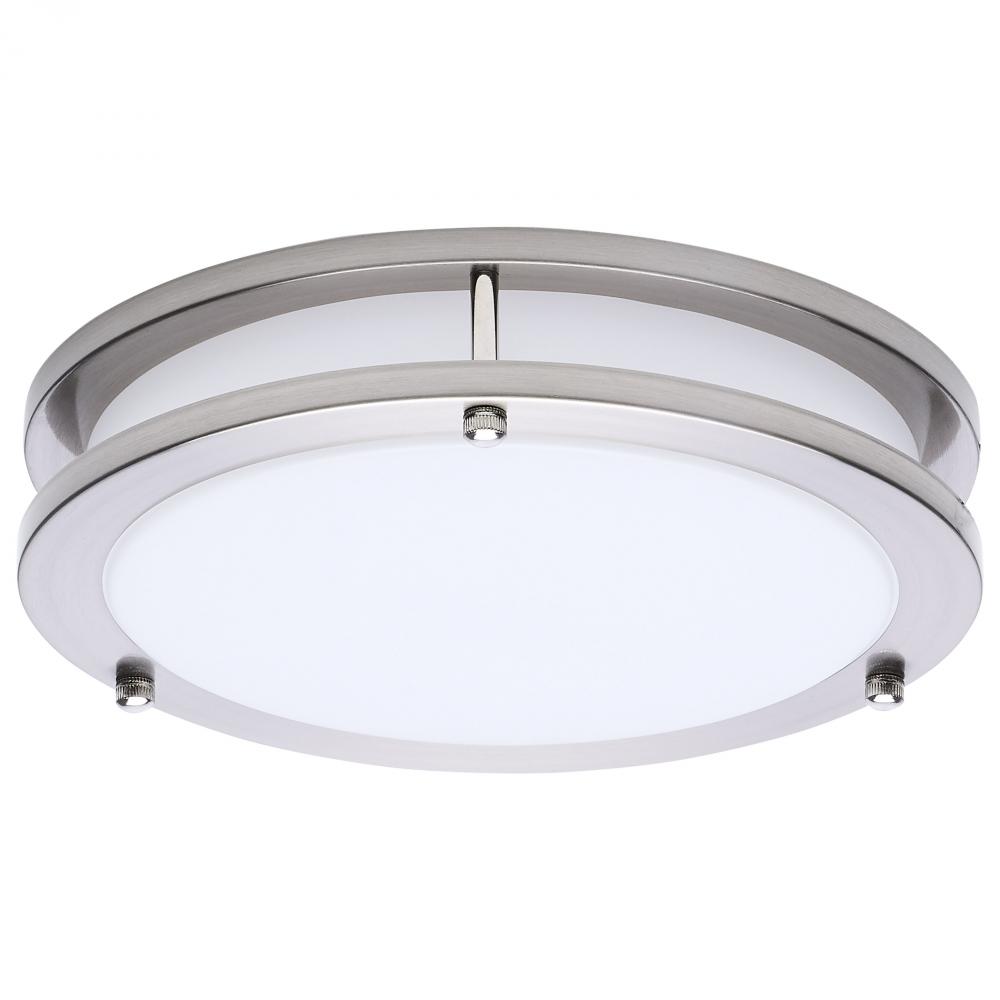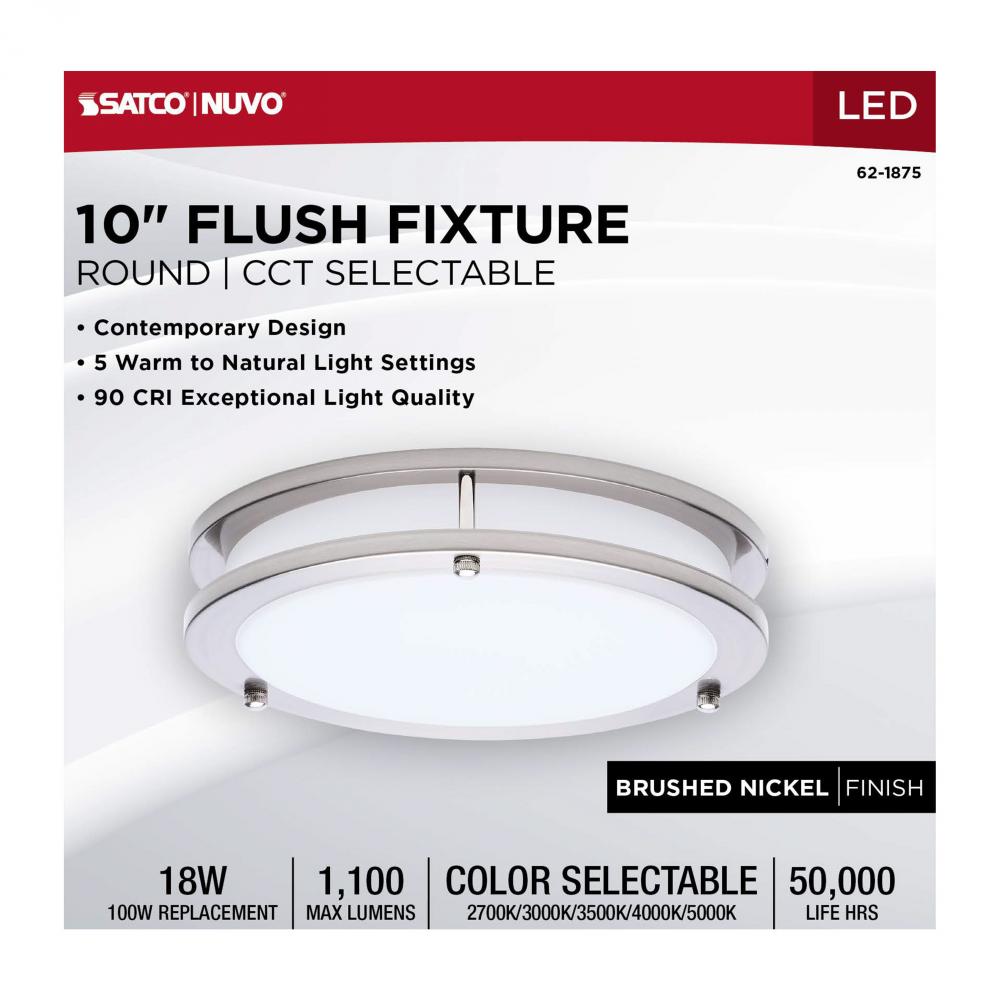 The SATCO NUVO 62-1875, Glamour 10-inch Round Flush Mount in Brushed Nickel delivers sleek, modern lighting with 5 CCT selectable technology (2700K–5000K) and 90 CRI illumination for vibrant color rendering. This 18-watt fixture replaces 100W incandescen