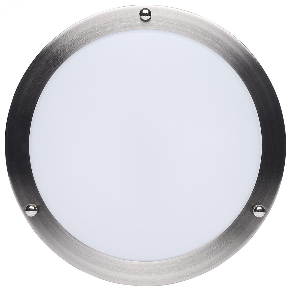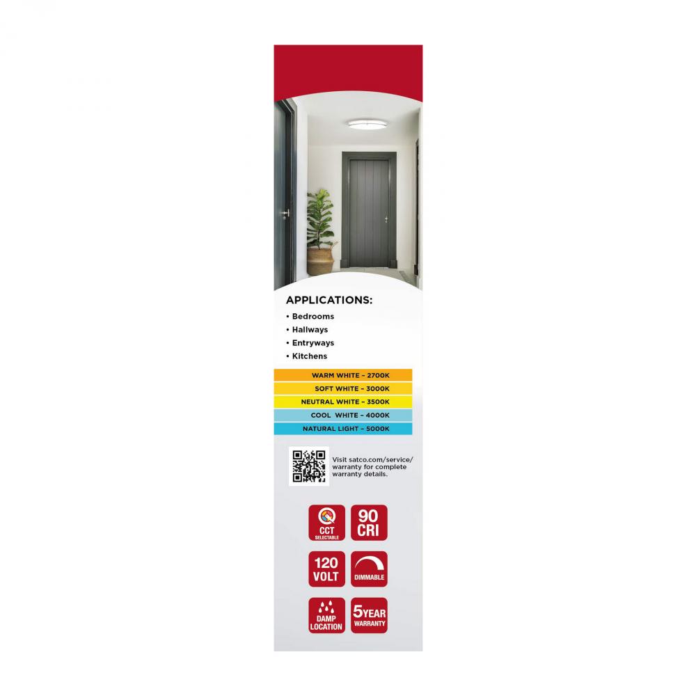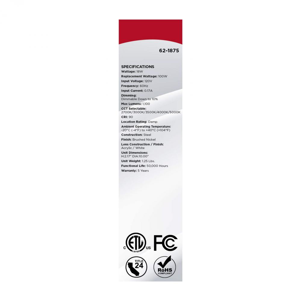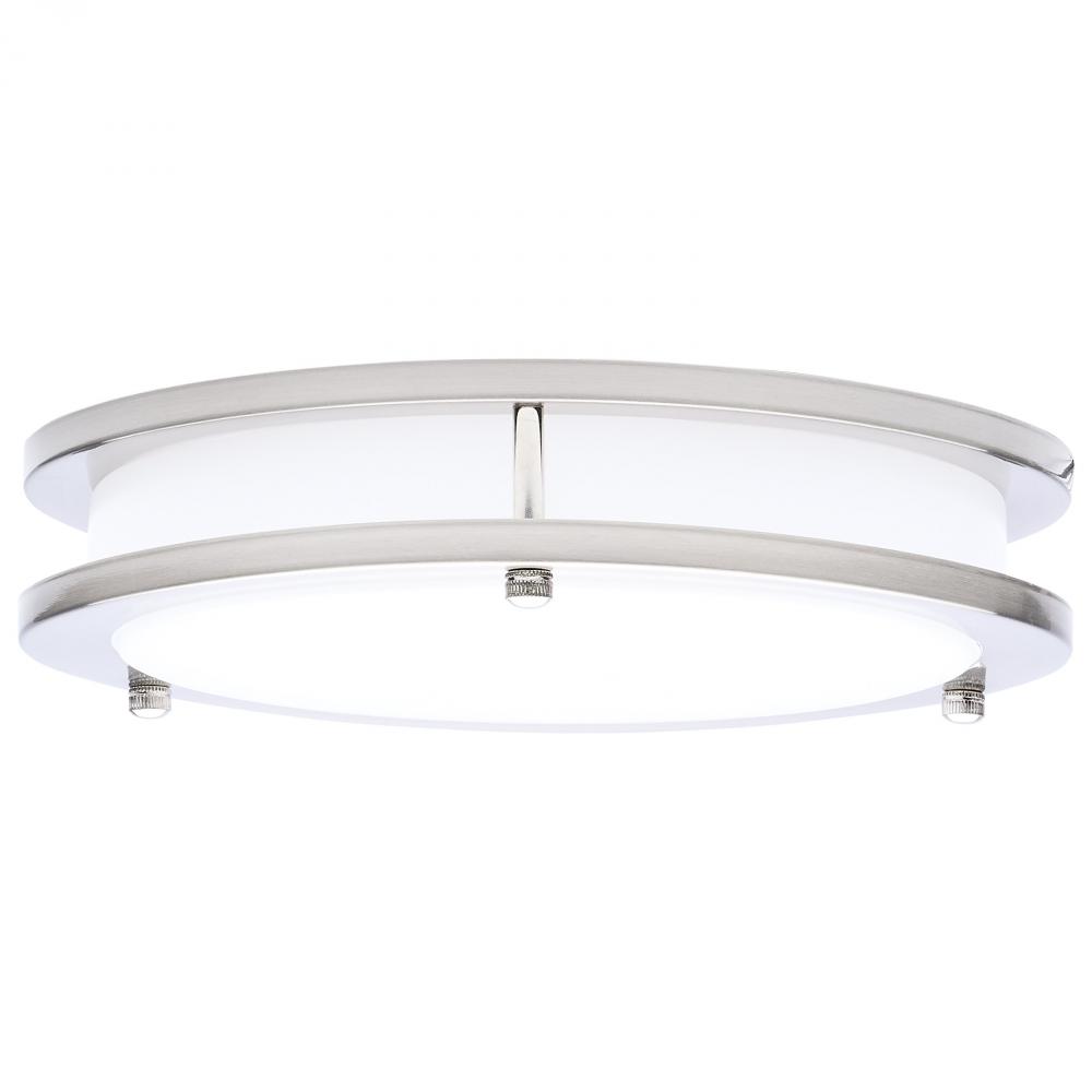 The SATCO NUVO 62-1875, Glamour 10-inch Round Flush Mount in Brushed Nickel delivers sleek, modern lighting with 5 CCT selectable technology (2700K–5000K) and 90 CRI illumination for vibrant color rendering. This 18-watt fixture replaces 100W incandescen