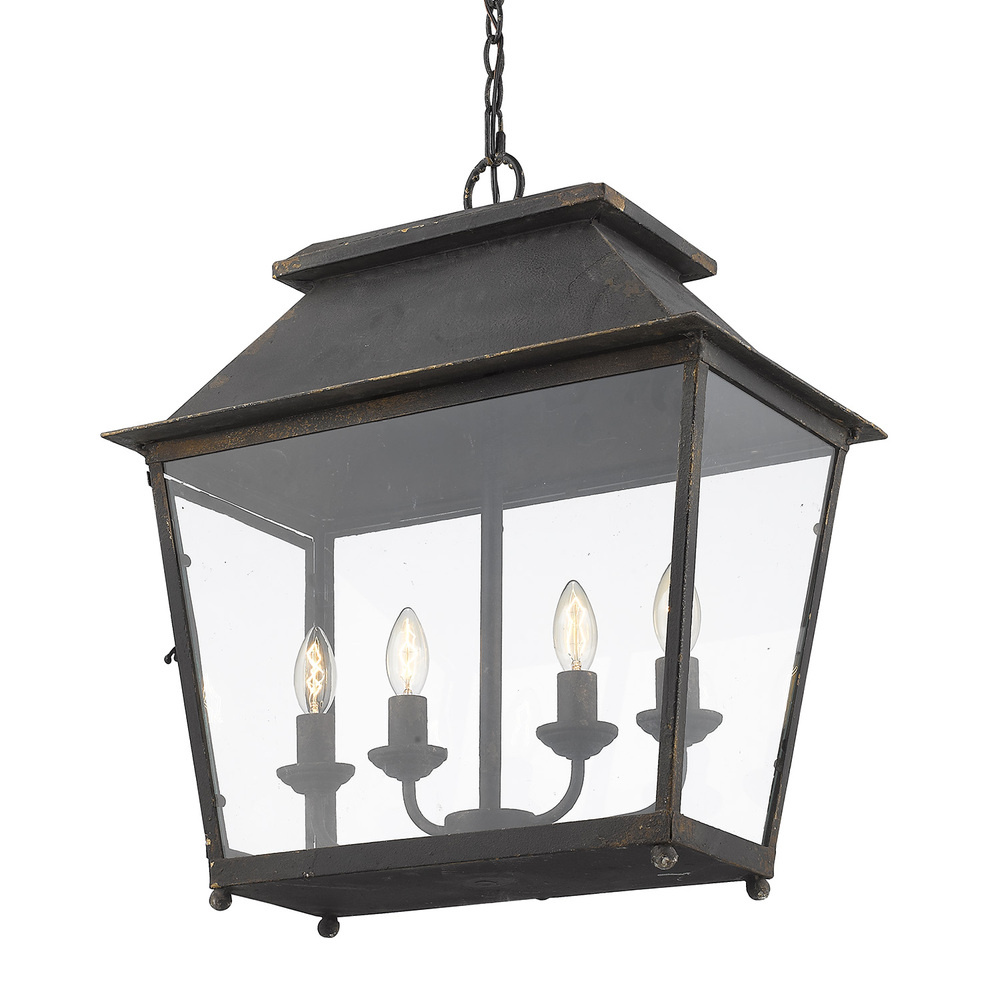 Bring rustic charm into your home with the Golden Lighting Abingdon 4-light Pendant in Antique Black Iron. Featuring a glass shade and an antique black iron frame, it creates a warm, welcoming atmosphere. The clear glass shade allows for brilliant, unobstructed light, making this fixture perfect for highlighting your space. Its high-gloss finish celebrates craftsmanship while complementing a range of styles from industrial to farmhouse. The antique black iron finish features a deeply textured and weathered appearance, adding authenticity to your décor. Suitable for various rooms like kitchens, dining rooms, and entryways, this pendant is Dry Location Rated, ideal for indoor spaces that are not subject to moisture. It is sloped-ceiling compatible and adjustable in height for versatile installation. Overall dimensions are 21.25"W x 24.25"H x 12.5"D, and it requires 4 E12 Candelabra base bulbs (not included), with a maximum wattage of 60 per bulb. Embrace cozy, inviting illumination with this unique pendant light, perfect for enhancing your home's character.
