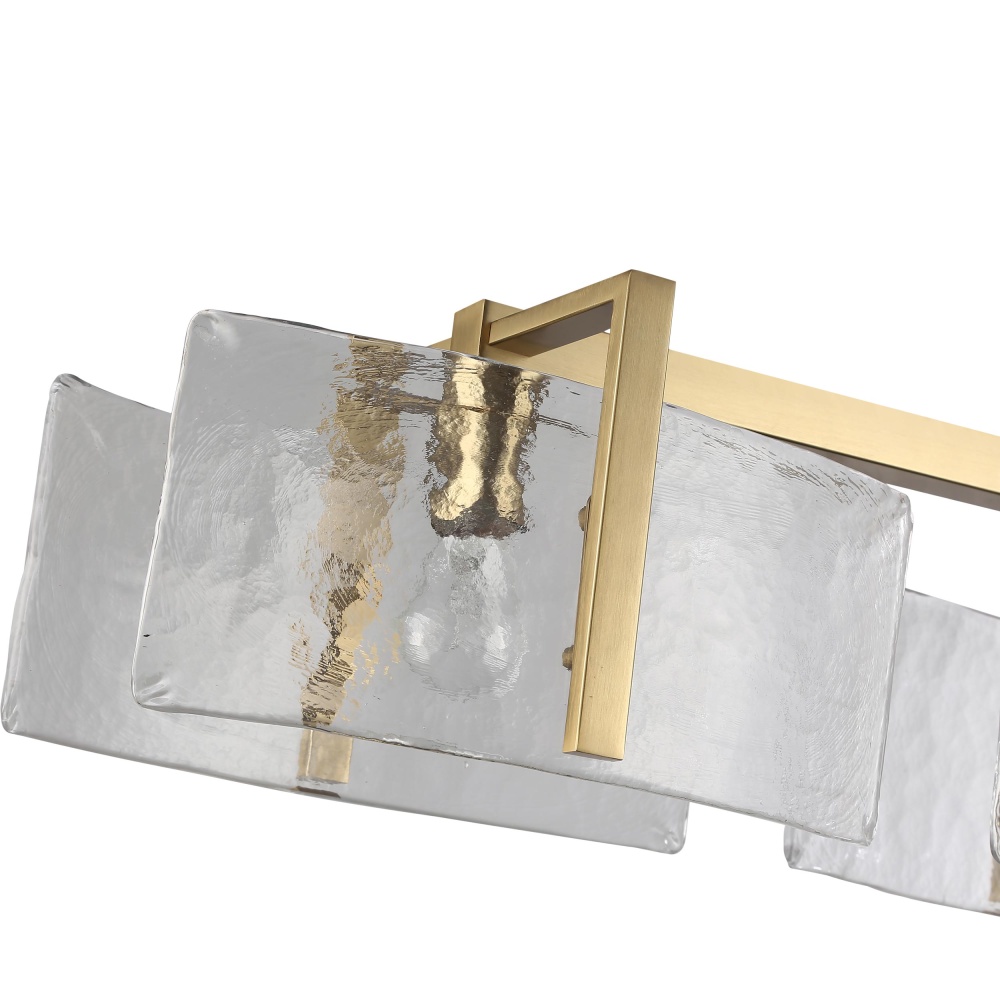 Bring Nature-Inspired elegance into your home with the Golden Lighting Aenon 3-light Island Light in Brushed Champagne Brass. Featuring a glass shade and a brushed champagne brass frame, it creates a welcoming atmosphere. The hammered water glass shade is a celebration of elemental beauty, capturing the dynamic essence of both ice and water. Each piece is expertly crafted with a deep, irregular texture that beautifully refracts light, casting dazzling patterns that enhance any space. Our brushed champagne brass finish offers an understated and elegant alternative to traditional gold, adding a touch of quiet luxury and contemporary style. Its fine, directional brushing provides a refined texture and satin sheen that beautifully catches the light. Designed specifically for kitchen islands, this fixture is dry location rated and ideal for indoor spaces not subject to moisture, such as bedrooms and hallways. It is sloped-ceiling compatible and features an adjustable height from 8.875" to 53.75" for a perfect fit in your home. Overall dimensions are 40.5"W x 8.13"H x 8.88"D, and it requires 3 E26 Medium base bulbs (not included), max wattage of 100 each. Enhance your living space with this high-quality fixture that beautifully blends artistry and functionality.
