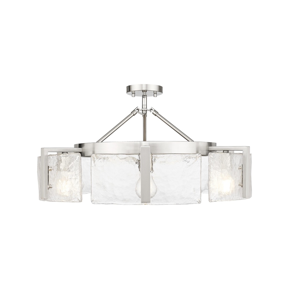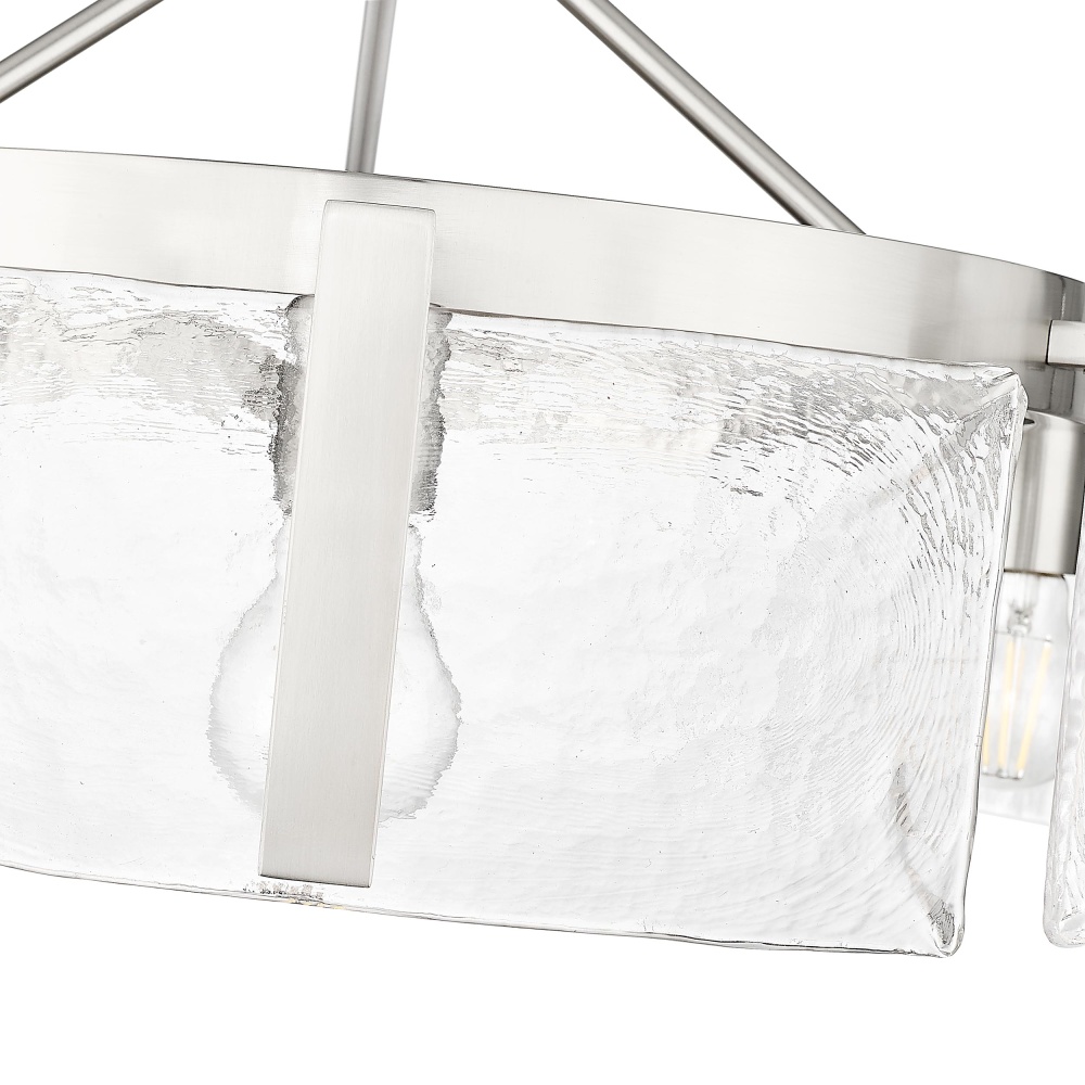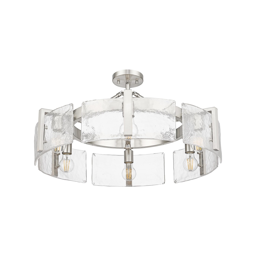 Bring nature-inspired elegance into your home with the Golden Lighting Aenon 6-light Semi-Flush Mount in Pewter. Featuring a glass shade and a pewter frame, it creates a welcoming atmosphere. The hammered water glass shade showcases a beautifully distorted light effect, capturing the unique essence of ice and water. Our Pewter finish offers a soft and classic alternative to brighter silver tones, while its durable construction ensures lasting quality. This fixture is perfect for entryways, bedrooms, kitchens, and living areas with mid-height ceilings. Rated for damp locations, it can be installed as a semi-flush mount or pendant, with an adjustable hanging height ranging from 8.75" to 14". Overall dimensions are 27.75"W x 8.75"H x 27.75"D, requiring six E26 medium base bulbs (not included) with a maximum wattage of 60 per bulb. Elevate your space with this stunning centerpiece that embodies both artistry and functionality.